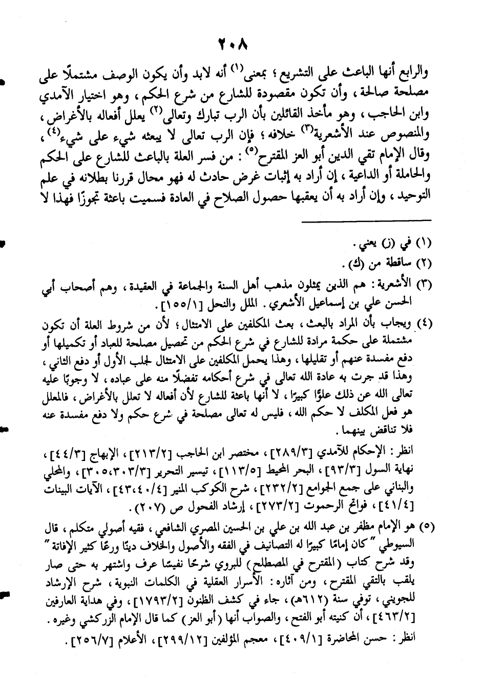 والرابع أنها الباعث على التشريع، بمعنى أنه لا بد وأن يكون الوصف مشتملاً على مصلحة صالحة، وأن تكون مقصودة للشارع من شرع الحكم، وهو اختيار الآمدي وابن الحاجب، وهو مأخذ القائلين بأن الرب تبارك وتعالى يعلل أفعاله بالأغراض، والمنصوص عند الأشرعية خلافه، فإن الرب تعالى لا يبعثه شيء على شيء، وقال الإمام تقي الدين أبو العز المقترح، من فسر العلة بالباعث للشارع على الحكم والحاملة أو الداعية، إن أراد به إثبات غرض حادث له فهو محال قررنا بطلانه في علم التوحيد، وإن أراد به أن يعقبها حصول الصلاح في العادة فسميت باعثة تجوزاً فهذا لا
