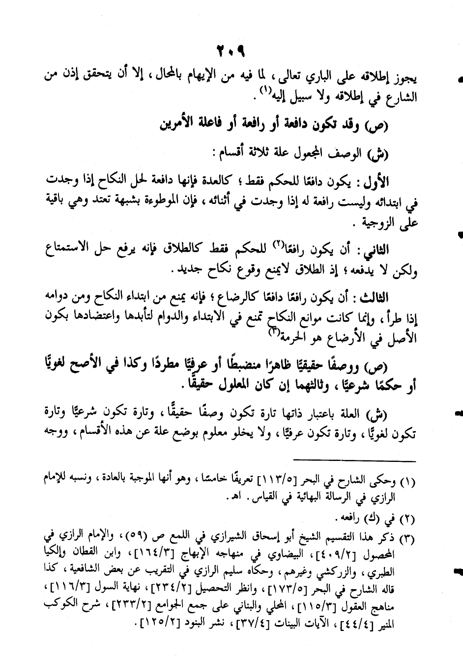 (ش): العلة باعتبار ذاتها تارة تكون وصفاً حقيقاً وتارة تكون شرعياً وتارة تكون لغويا، وتارة تكون عرفياً، ولا يخلو معلوم بوضع علة عن هذه الأقسام، ووجه