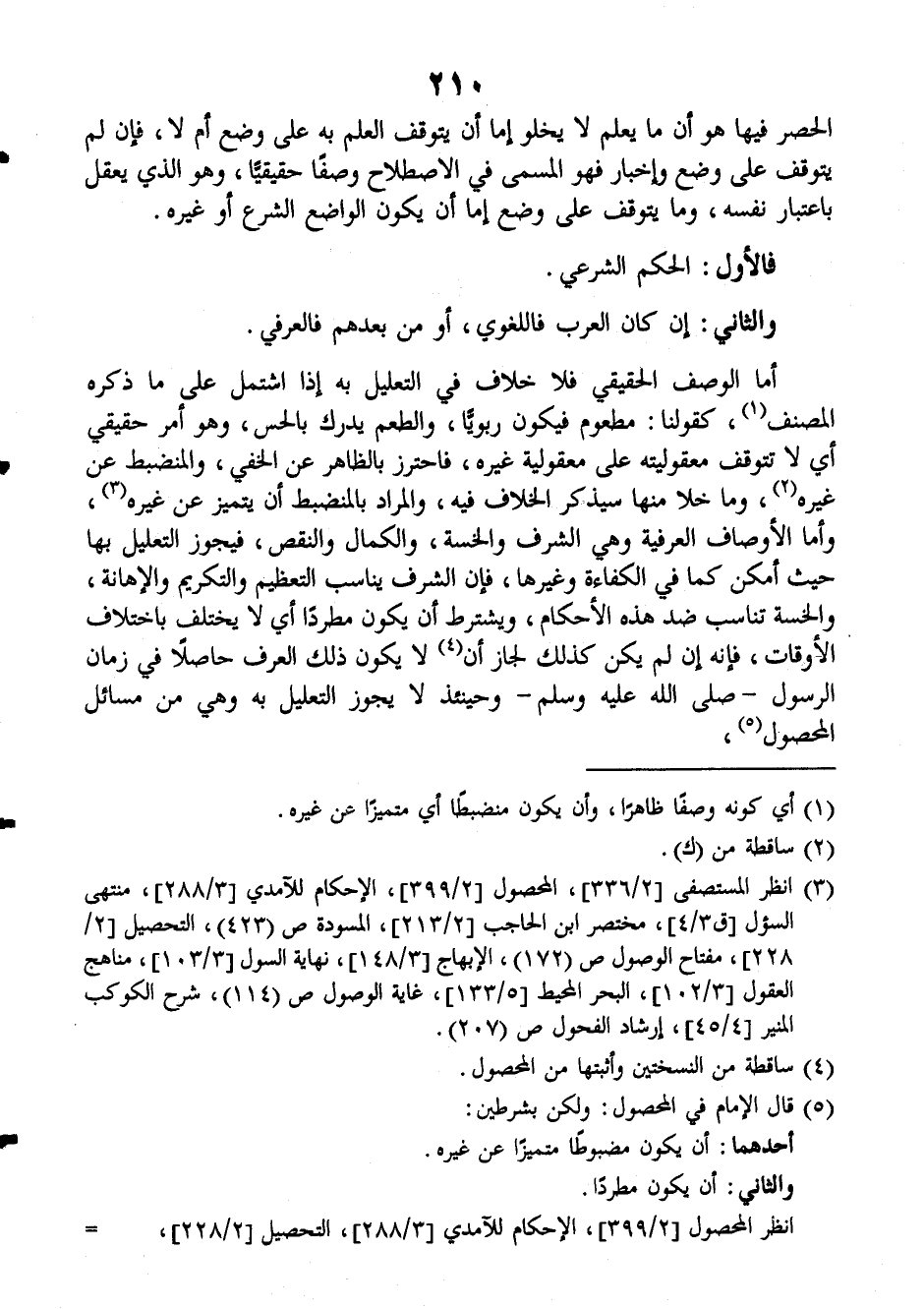 أما الوصف الحقيقي فلا خلاف في التعليل به إذا اشتمل على ما ذكره المصنف كقولنا: مطعوم فيكون ربوياً، والطعم يدرك بالحس، وهو أمر حقيقي أي لا تتوقف معقوليته على معقولية غيره، فاحترز بالظاهر عن الخفي، والمنضبط عن غيره، وما خلا منها سيذكر الخلاف فيه، والمراد بالمنضبط أن يتميز عن غيره، وأما الأوصاف العرفية وهي الشرف والخسة، والكمال والنقص، فيجوز التعليل بها حيث أمكن كما في الكفاءة وغيرها، فإن الشرف يناسب التعظيم والتكريم والإهانة، والخسة تناسب ضد هذه الأحكام، ويشترط أن يكون مطردا أي لا يختلف باختلاف الأوقات، فإنه إن لم يكن كذلك لجاز أن لا يكون ذلك العرف حاصلاً باختلاف الأوقات، فإنه إن لم يكن كذلك لجاز أن لا يكون ذلك العرف حاصلاً في زمان الرسول صَلَّى اللهُ عَلَيْهِ وَسَلَّمَ وحينئذ لا يجوز التعليل به وهي من مسائل (المحصول).