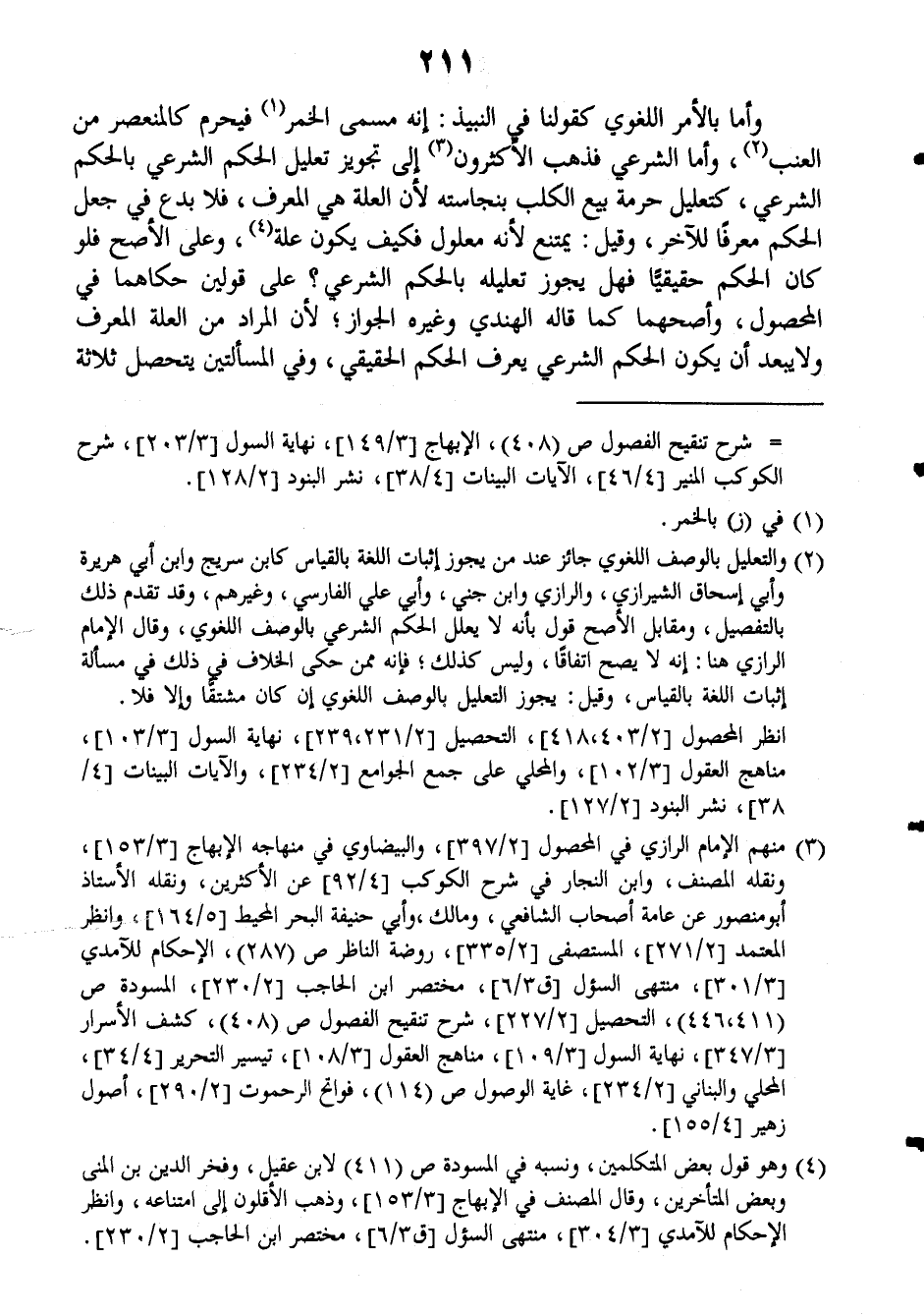 وأما بالأمر الغوي كقولنا في النبيذ: إنه مسمى الخمر، فيحرم كالمنعصر من العنب وأما الشرعي فذهب الأكثرون، إلى تجويز تعليل الحكم الشرعي بالحكم الشرعي، كتعليل حرمة بيع الكلب بنجاسته لأن العلة هي العرف، فلا بدع في جعل الحكم معرفاً للآخر، وقيل: يمتنع لأنه معلول فكيف يكون علة، وعلى الأصح فلو كان الحكم حقيقياً فهل يجوز تعليله بالحكم الشرعي؟ على قولين حكاهما في (المحصول)، وأصحهما كما قاله الهندي وغيره الجواز، لأن المراد من العلة المعرف ولا يبعد أن يكون الحكم الشرعي يعرف الحكم الحقيقي، وفي المسألتين يتحصل ثلاثة