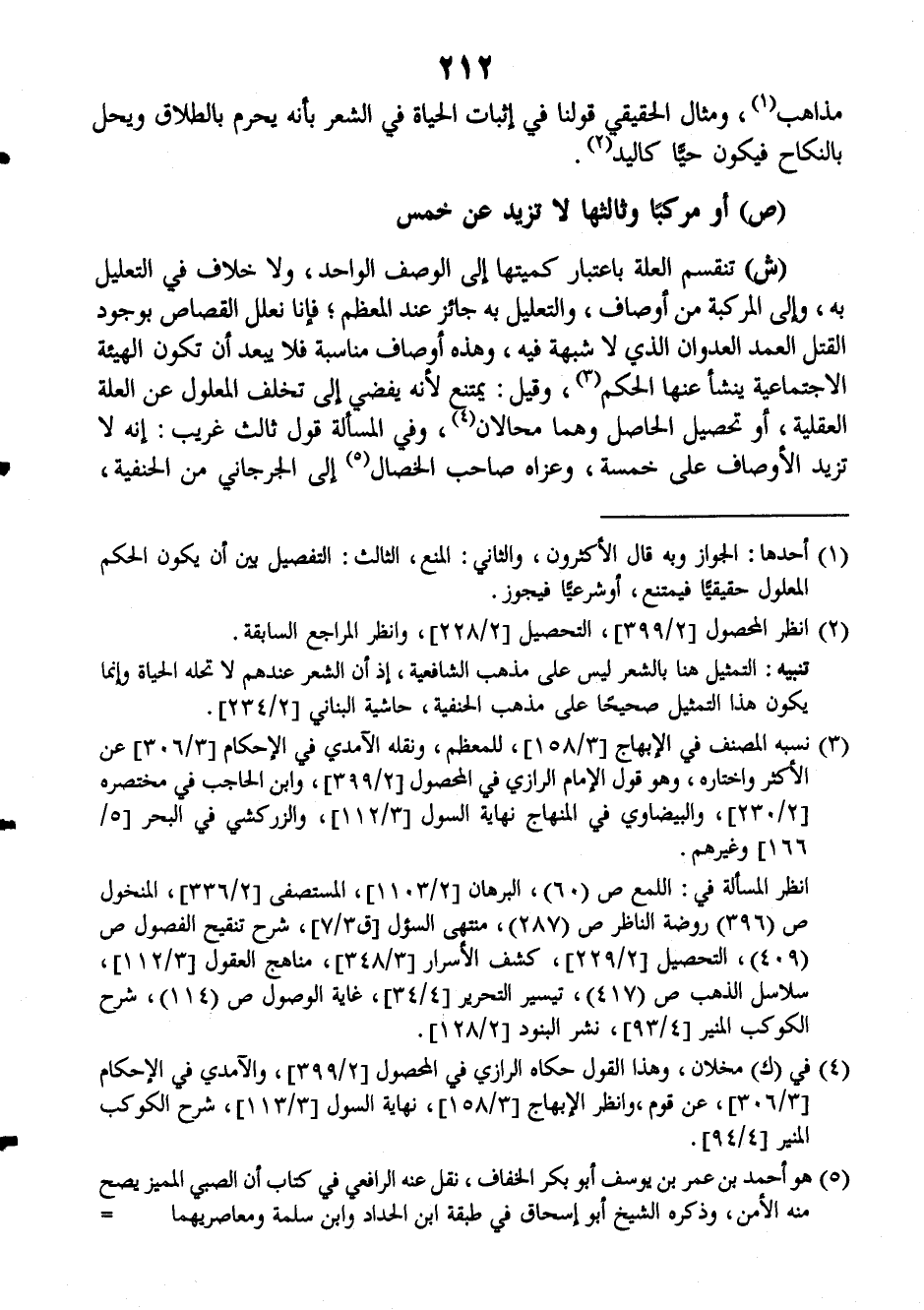 (ش): تنقسم العلة باعتبار كميتها إلى الوصف الواحد، ولا خلاف في التعليل به، وإلى المركبة من أوصاف، والتعليل به جائز عند المعظم، فإنا نعلل القصاص بوجود القتل العمد العدوان الذي لا شبهة فيه، وهذه أوصاف مناسبة فلا يبعد أن تكون الهيئة الاجتماعية ينشأ عنها الحكم، وقيل: يمتنع لأنه يفضي إلى تخلف المعلول عن العلة العقلية، أو تحصيل الحاصل وهما محالان، وفي المسألة قول ثالث غريب: إنه لا تزيد الأوصاف على خمسة، وعزاه صاحب (الخصال) إلى الجرجاني من الحنفية،