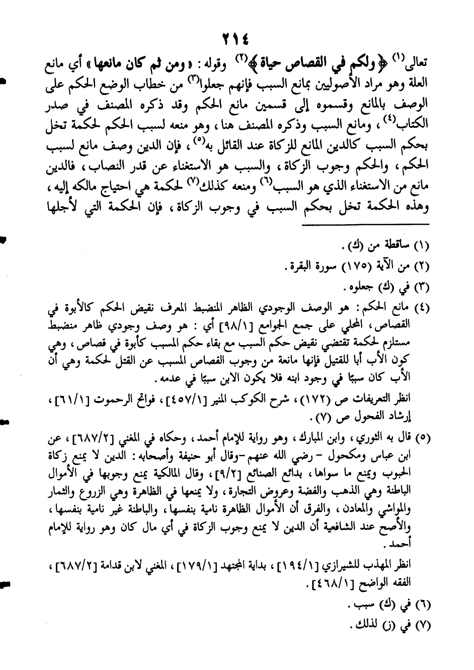 تعالى: {ولكم في القصاص حياة} وقوله: (ومن ثم كان مانعها) أي مانع العلة وهو مراد الأصوليين بمانع السبب فإنهم جعلوا من خطاب الوضع الحكم على الوصف بالمانع وقسموه إلى قسمين مانع الحكم وقد ذكره المصنف في صدر الكتاب ومانع السبب وذكره المصنف هنا، وهو منعه لسبب الحكم لحكمة تخل بحكم السبب كالدين المانع للزكاة عند القائل به، فإن الدين وصف مانع لسبب الحكم، والحكم وجوب الزكاة، والسبب هو الاستغناء عن قدر النصاب، فالدين مانع من الاستغناء الذي هو السبب ومنعه كذلك لحكمة هي احتياج مالكه إليه، وهذه الحكمة تخل بحكم السبب في وجوب الزكاة، فإن الحكمة التي لأجلها