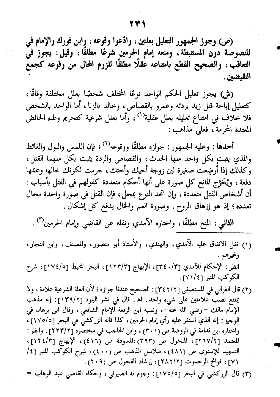(ش): يجوز تعليل الحكم الواحد نوعاً المختلف شخصاً بعلل مختلفة، وفاقاً، كتعليل إباحة قتل زيد بردته وعمرو بالقصاص، وخالد بالزنا، أما الواحد بالشخص فلا خلاف في امتناع تعليله بعلل عقلية، وأما بعلل شرعية كتحريم وطء الحائض المعتدة المحرمة، فعلى مذاهب: