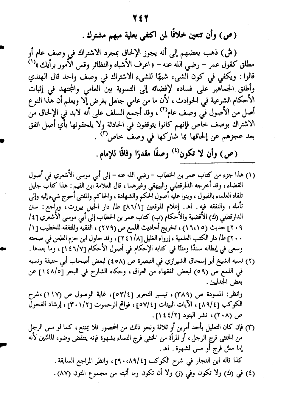 (ش): ذهب بعضهم إلى أنه يجوز الإلحاق بمجرد الاشتراك في وصف عام أو مطلق كقول عمر رضي الله عنه: (اعرف الأشباه والنظائر وقس الأمور برأيك) قالوا: ويكفي في كون الشيء شبهاً للشيء الاشتراك في وصف واحد قال الهندي وأطلق الجماهير على فساده لإفضائه إلى التسوية بين العامي والمجتهد في إثبات الأحكام الشرعية في الحوادث لأن ما من عامي جاهل بغرض إلا ويعلم أن هذا النوع أصل من الأصول في وصف عام وقد أجمع السلف على أنه لا بد في الإلحاق من الاشتراك بوصف خاص فإنهم كانوا يتوقفون في الحادثة ولا يلحقونها بأي أصل اتفق بعد عجزهم عن إلحاقها بما شاركها في وصف خاص.