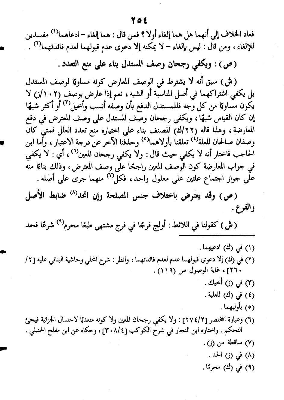 (ش): سبق أنه لا يشترط في الوصف المعارض كونه مساوياً لوصف المستدل بل يكفي اشتراكهما في أصل المناسبة أو الشبه، نعم إذا عارض بوصف (١٠٢/ ز) لا يكون مساوياً من كل وجه فللمستدل الدفع بأن وصفه أنسب وأخيل أو أكثر شبهاً إن كان القياس شبهاً، ويكفي رجحان وصف المستدل على وصف المعترض في دفع المعارضة، وهذا قاله (٢٢/ك) المصنف بناء على اختياره منع تعدد العلل فمتى كان وصفان صالحان للعلة تعلقنا بأولاهما وحذفنا الآخر عن درجة الاعتبار، وأما ابن الحاجب فاختار أنه لا يكفي حيث قال: ولا يكفي رجحان المعين، أي: لا يكفي في جواب المعارضة كون الوصف المعين راجحاً على وصف المعترض وذلك بناء منه على جواز اجتماع علتين على معلول واحد، فكل منهما جرى على أصله.