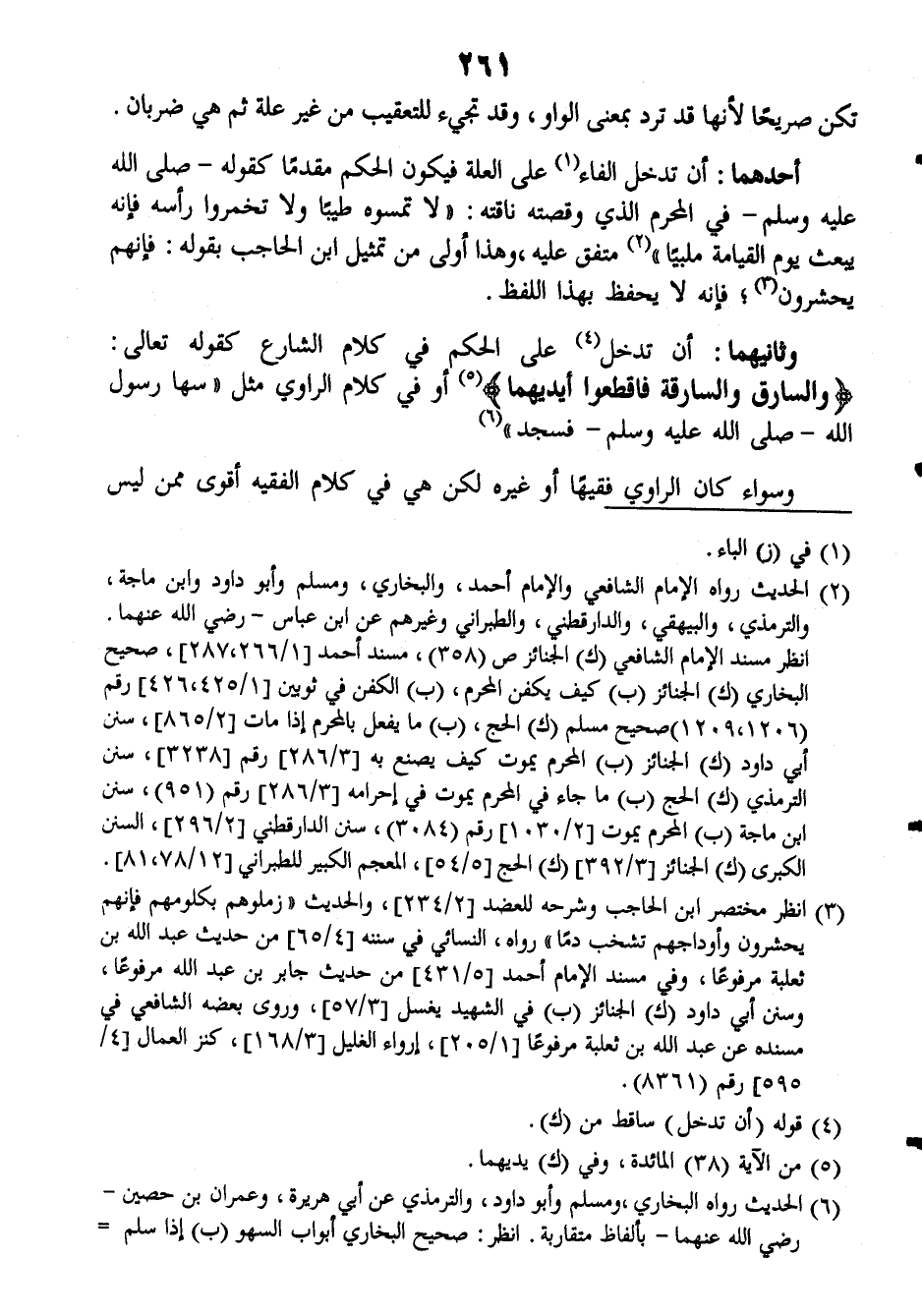 أحدهما: أن تدخل الفاء على العلة فيكون الحكم مقدماً كقوله صَلَّى اللهُ عَلَيْهِ وَسَلَّمَ في المحرم الذي وقصته ناقته: ((لا تمسوه طيباً ولا تخمروا رأسه فإنه يبعث يوم القيامة ملبياً)) متفق عليه، وهذا أولى من تمثيل ابن الحاجب بقوله: فإنهم يحشرون فإنه لا يحفظ بهذا اللفظ.