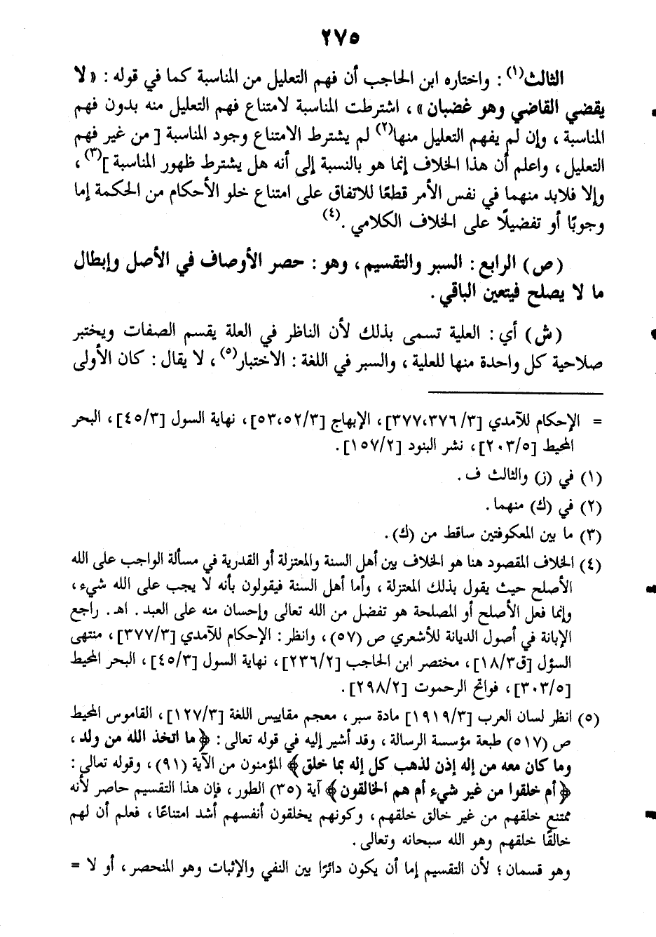 الثالث: واختاره ابن الحاجب أن فهم التعليل من المناسبة كما في قوله: ((لا يقضي القاضي وهو غضبان)) اشترطت المناسبة لامتناع فهم التعليل منه بدون فهم المناسبة، وإن لم يفهم التعليل منها لم يشترط الامتناع وجود المناسبة من غير فهم التعليل، واعلم أن هذا الخلاف إنما هو بالنسبة إلى أنه هل يشترط ظهور المناسبة، وإلا فلا بد منهما في نفس الأمر قطعاً للاتفاق على امتناع خلو الأحكام من الحكمة إما وجوباً أو تفضيلاً على الخلاف الكلامي.