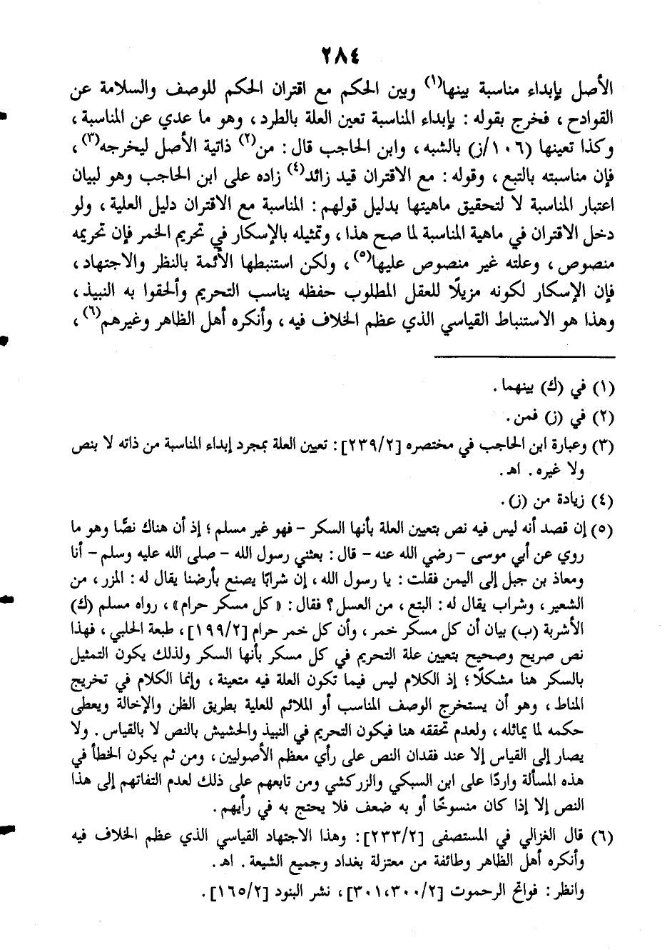 الأصل بإبداء مناسبة بينها، وبين الحكم مع اقتران الحكم للوصف والسلامة عن القوادح، فخرج بقوله: بإبداء المناسبة تعين العلة بالطرد، وهو ما عدي عن المناسبة، وكذا تعينها (١٠٦/ز) بالشبه، وابن الحاجب قال: من ذاتية الأصل ليخرجه، فإن مناسبته بالتبع، وقوله: مع الاقتران قيد زائد، زاده على ابن الحاجب وهو لبيان اعتبار المناسبة لا لتحقيق ماهيتها بدليل قولهم: المناسبة مع الاقتران دليل العلية، ولو دخل الاقتران في ماهية المناسبة لما صح هذا، وتمثيله بالإسكار في تحريم الخمر فإن تحريمه منصوص، وعلته غير منصوص عليها، ولكن استنبطها الأئمة بالنظر والاجتهاد، فإن الإسكار لكونه مزيلا للعقل المطلوب حفظه يناسب التحريم وألحقوا به النبيذ، وهذا هو الاستنباط القياسي الذي عظم الخلاف فيه وأنكره أهل الظاهر وغيرهم،