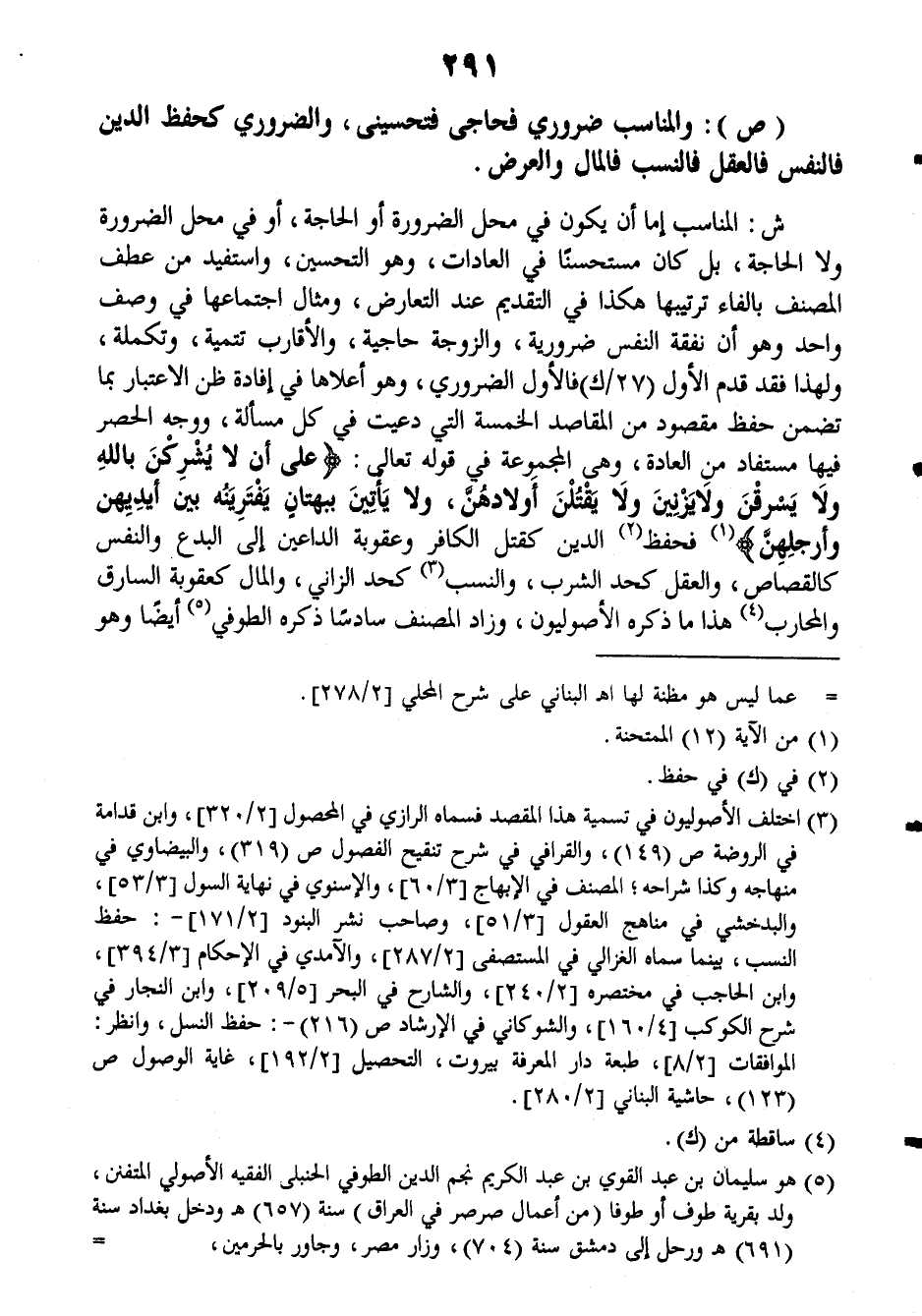 (ش): المناسب إما أن يكون في محل الضرورة أو الحاجة، أو في محل الضرورة ولا الحاجة، بل كان مستحسناً في العادات، وهو التحسين، واستفيد من عطف المصنف بالفاء ترتيبها هكذا في التقديم عند التعارض، ومثال اجتماعها في وصف واحد وهو أن نفقة النفس ضرورية، والزوجة حاجية، والأقارب تتمية، وتكملة ولهذا فقد قدم الأول (٢٧/ك) فالأول الضروري، وهو أعلاها في إفادة ظن الاعتبار بما تضمن حفظ مقصود من المقاصد الخمسة التي دعيت في كل مسألة، ووجه الحصر فيها مستفاد من العادة وهي المجموعة في قوله تعالى: {على أن لا يشركن بالله ولا يسرقن ولا يزنين ولا يقتلن أولادهن، ولا يأتين ببهتان يفترينه بين أيديهن وأرجلهن} فحفظ الدين كقتل الكافر وعقوبة الداعين إلى البدع والنفس كالقصاص، والعقل كحد الشرب، والنسب كحد الزاني، والمال كعقوبة السارق والمحارب، هذا ما ذكره الأصوليون، وزاد المصنف سادساً ذكره الطوفي أيضاً وهو