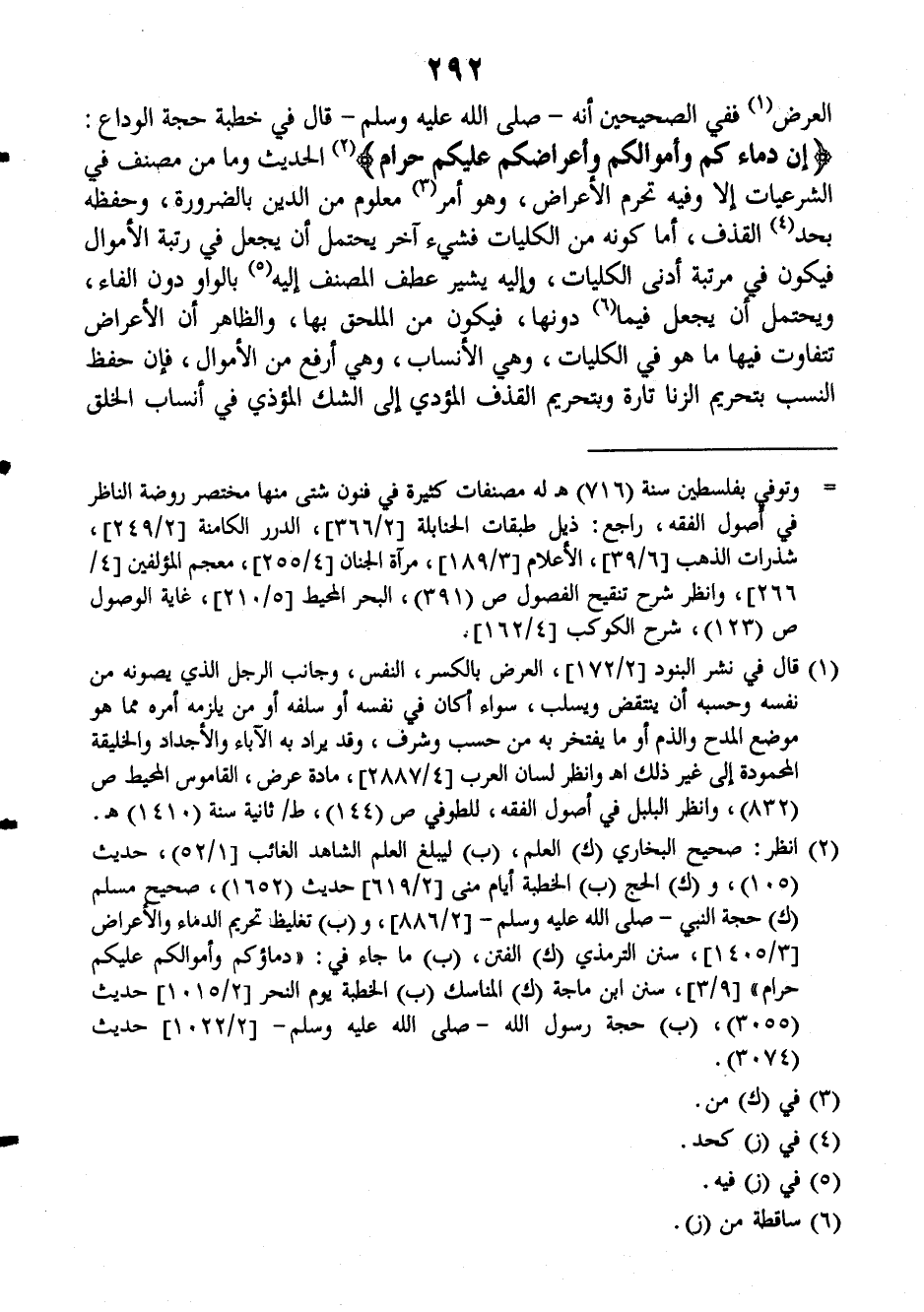 العرض ففي الصحيحين أنه صلى الله عليه وسلم قال في خطبة حجة الوداع: ((إن دماءكم وأموالكم وأعراضكم عليكم حرام)) الحديث وما من مصنف في الشرعيات إلا وفيه تحرم الأعراض، وهو أمر معلوم من الدين بالضرورة، وحفظه بحد القذف، أما كونه من الكليات فشيء آخر يحتمل أن يجعل في رتبة الأموال فيكون في مرتبة أدنى الكليات، وإليه يشير عطف المصنف إليه بالواو دون الفاء، ويحتمل أن يجعل فيما دونها، فيكون من الملحق بها، والظاهر أن الأعراض تتفاوت فيها ما هو في الكليات، وهي الأنساب، وهي أرفع من الأموال، فإن حفظ النسب بتحريم الزنا تارة وبتحريم القذف المؤدي إلى الشك المؤذي في أنساب الخلق