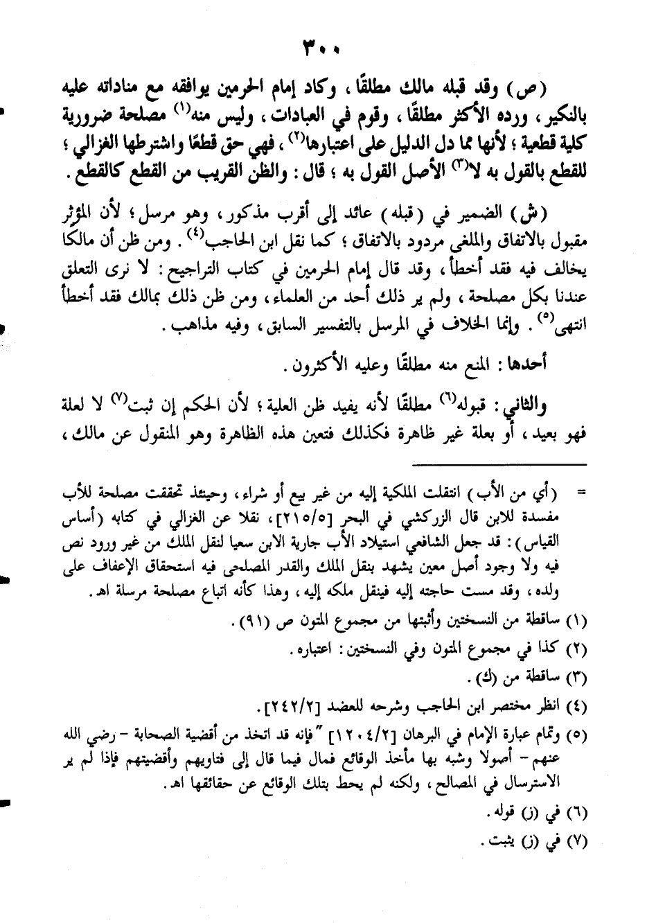 (ص): وقد قبله مالك مطلقاً، وكاد إمام الحرمين يوافقه مع مناداته عليه بالنكير، ورده الأكثر مطلقاً وقوم في العبادات، وليس منه مصلحة ضرورية كلية قطعية، لأنها مما دل الدليل على اعتبارها، فهي حق قطعاً واشترطها الغزالي، للقطع بالقول به لا الأصل القول به، قال: والظن القريب من القطع كالقطع.
