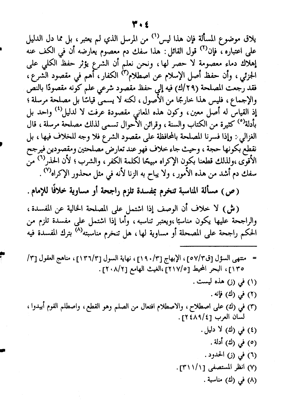 قياساً بل مصلحة مرسلة، إذ القياس له أصل معين، وكون هذه المعاني مقصودة عرفت لا لدليل واحد بل بأدلة كثيرة من الكتاب والسنة وقرائن الأحوال تسمى لذلك مصلحة مرسلة، قال الغزالي، وإذا فسرنا المصلحة بالمحافظة على مقصود الشرع فلا وجه للخلاف فيها، بل نقطع بكونها حجة، وحيث جاء خلاف فهو عند تعارض مصلحتين ومقصودين فيرجح الأقوى ولذلك قطعنا بكون الإكراه مبيحاً لكلمة الكفر، والشرب لأن الحذر من سفك دم أشد من هذه الأمور، ولا يباح به الزنا لأنه في مثل محذور الإكراه.