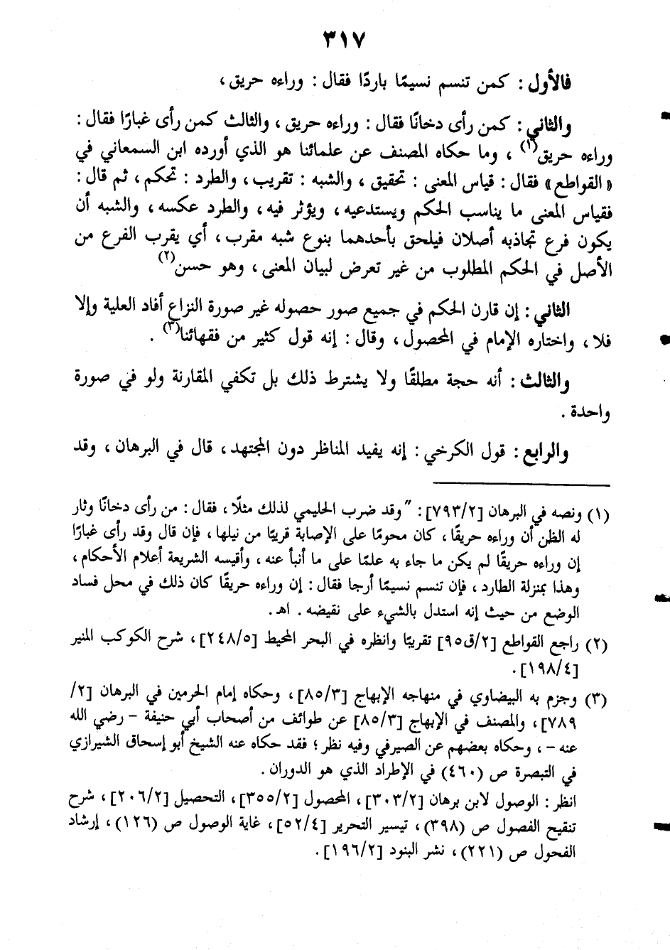 والثاني: كمن رأى دخاناً فقال: وراءه حريق، والثالث كمن رأى غباراً فقال: وراءه حريق، وما حكاه المصنف عن علمائنا هو الذي أورده ابن السمعاني في (القواطع) فقال: قياس المعنى: تحقيق والشبه تقريب والطرد تحكم ثم قال: فقياس المعنى ما يناسب الحكم ويستدعيه، ويؤثر فيه، والطرد عكسه، والشبه أن يكون فرع تجاذبه أصلان فيلحق بأحدهما بنوع شبه مقرب، أي يقرب الفرع من الأصل في الحكم المطلوب من غير تعرض لبيان المعنى، وهو حسن.