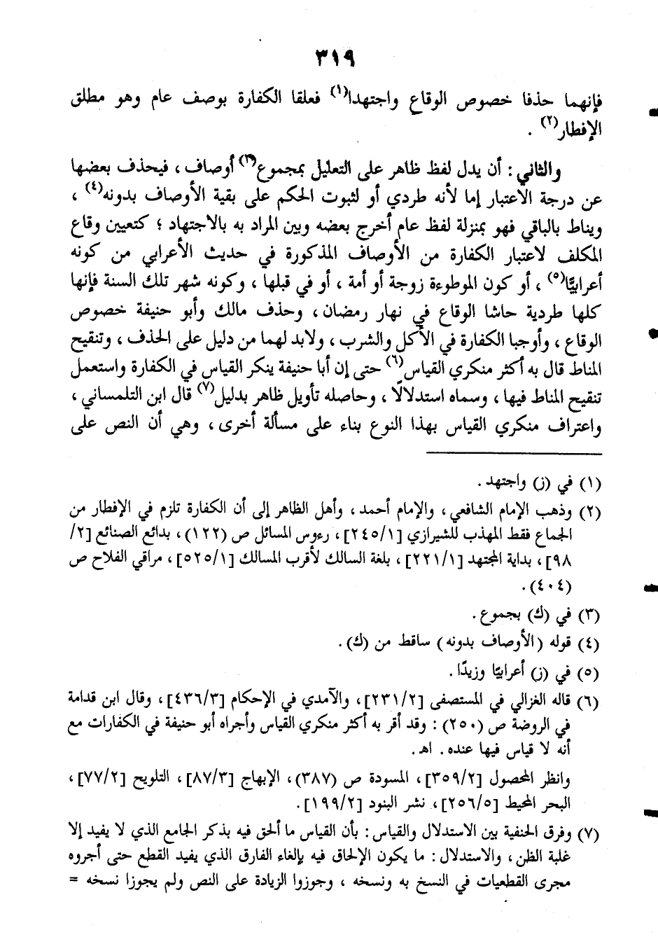 والثاني: أن يدل لفظ ظاهر على التعليل بمجموع أوصاف، فيحذف بعضها عن درجة الاعتبار إما لأنه طردي أو لثبوت الحكم على بقية الأوصاف بدونه، ويناط بالباقي فهو بمنزلة لفظ عام أخرج بعضه وبين المراد به بالاجتهاد، كتعيين وقاع المكلف لاعتبار الكفارة من الأوصاف المذكورة في حديث الأعرابي من كونه أعرابياً أو كون الموطوءة زوجة أو أمة، أو في قبلها، وكونه شهر تلك السنة فإنها كلها طردية حاشا الوقاع في نهار رمضان، وحذف مالك وأبو حنيفة خصوص الوقاع وأوجبا الكفارة في الأكل والشرب، ولا بد لهما من دليل على الحذف، وتنقيح المناط قال به أكثر منكري القياس حتى إن أبا حنيفة ينكر القياس في الكفارة واستعمل تنقيح المناط فيها، وسماه استدلالاً، وحاصله تأويل ظاهر بدليل قال ابن التلمساني، واعتراف منكري القياس بهذا النوع بناء على مسألة أخرى، وهي أن النص على
