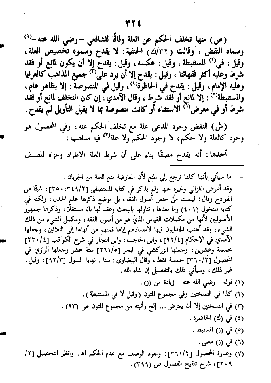 (ص): منها تخلف الحكم عن العلة وفاقاً للشافعي رضي الله عنه وسماه النقض، وقالت (٣٢/ك) الحنفية: لا يقدح وسموه تخصيص العلة، وقيل: في المستنبطة، وقيل: عكسه، وقيل: يقدح إلا أن يكون لمانع أو فقد شرط وعليه أكثر فقهائنا، وقيل: يقدح إلا أن يرد على جميع المذاهب كالعرايا وعليه الإمام، وقيل: يقدح في الحاضرة، وقيل في المنصوصة: إلا بظاهر عام، والمستنبطة إلا لمانع أو فقد شرط، وقال الآمدي: إن كان التخلف لمانع أو فقد شرط أو في معرض الاستثناء أو كانت منصوصة بما لا يقبل التأويل لم يقدح.
