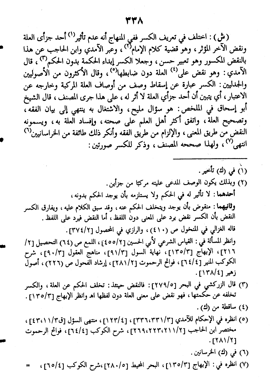 (ش): اختلف في تعريف الكسر ففي (المنهاج) أنه عدم تأثير أحد جزأي العلة ونقض الآخر المؤثر، وهو قضية كلام الإمام، وعبر الآمدي وابن الحاجب عن هذا بالنقض المكسور وهو تعبير حسن، وجعلا الكسر إبداء الحكمة بدون الحكم، قال الآمدي: وهو نقض على العلة دون ضابطها وقال الأكثرون من الأصوليين والجدليين: الكسر عبارة عن إسقاط وصف من أوصاف العلة المركبة وخارجه عن الاعتبار، أي يتبين أن أحد جزأي العلة لا أثر له، على هذا جرى المصنف، قال الشيخ أبو إسحاق في (الملخص): هو سؤال مليح، والاشتغال به ينتهي إلى بيان الفقه، وتصحيح العلة، واتفق أكثر أهل العلم على صحته، وإفساد العلة به، ويسمونه النقض من طريق المعنى، والإلزام من طريق الفقه وأنكر ذلك طائفة من الخراسانيين انتهى، ولهذا صححه المصنف، وذكر للكسر صورتين:
