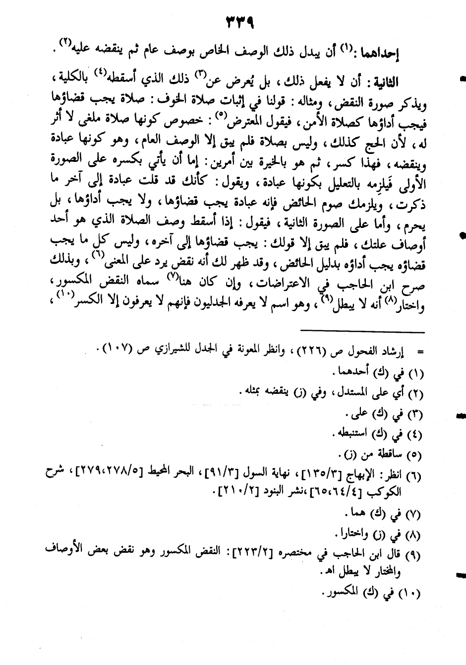 الثانية: أن لا يفعل ذلك، بل يعرض عن ذلك الذي أسقطه بالكلية، ويذكر صورة النقض، ومثاله: قولنا في إثبات صلاة الخوف، صلاة يجب قضاؤها فيجب أداؤها كصلاة الأمن، فيقول المعترض: خصوص كونها صلاة ملغى لا أثر له، لأن الحج كذلك، وليس بصلاة فلم يبق إلا الوصف العام، وهو كونها عبادة وينقضه، فهذا كسر، ثم هو بالخيرة بين أمرين: إما أن يأتي بكسره على الصورة الأولى فيلزمه بالتعليل بكونها عبادة، ويقول: كأنك قد قلت عبادة إلى آخر ما ذكرت، ويلزمك صوم الحائض فإنه عبادة يجب قضاؤها، ولا يجب أداؤها، بل يحرم، وأما على الصورة الثانية، فيقول: إذا أسقط وصف الصلاة الذي هو أحد أوصاف علتك، فلم يبق إلا قولك: يجب قضاؤها إلى آخره، وليس كل ما يجب قضاؤه يجب أداؤه بدليل الحائض، وقد ظهر لك أنه نقض يرد على المعنى، وبذلك صرح ابن الحاجب في الاعتراضات، وإن كان هنا سماه النقض المكسور، واختار، أنه لا يبطل، وهو اسم لا يعرفه الجدليون فإنهم لا يعرفون إلا الكسر،