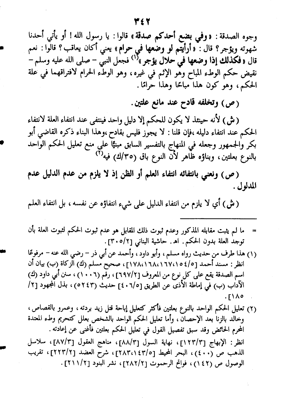 وجوه الصدقة: ((وفي بضع أحدكم صدقة)) قالوا: يا رسول الله! أو يأتي أحدنا شهوته ويؤجر؟ قال: ((أرأيتم لو وضعها في حرام)) يعني أكان يعاقب؟ قالوا: نعم قال: ((فكذلك إذا وضعها في حلال يؤجر)) فجعل النبي صلى الله عليه وسلم نقيض حكم الوطء المباح وهو الإثم في غيره، وهو الوطء الحرام لافتراقهما في علة الحكم، وهو كون هذا مباحاً وهذا حراماً.