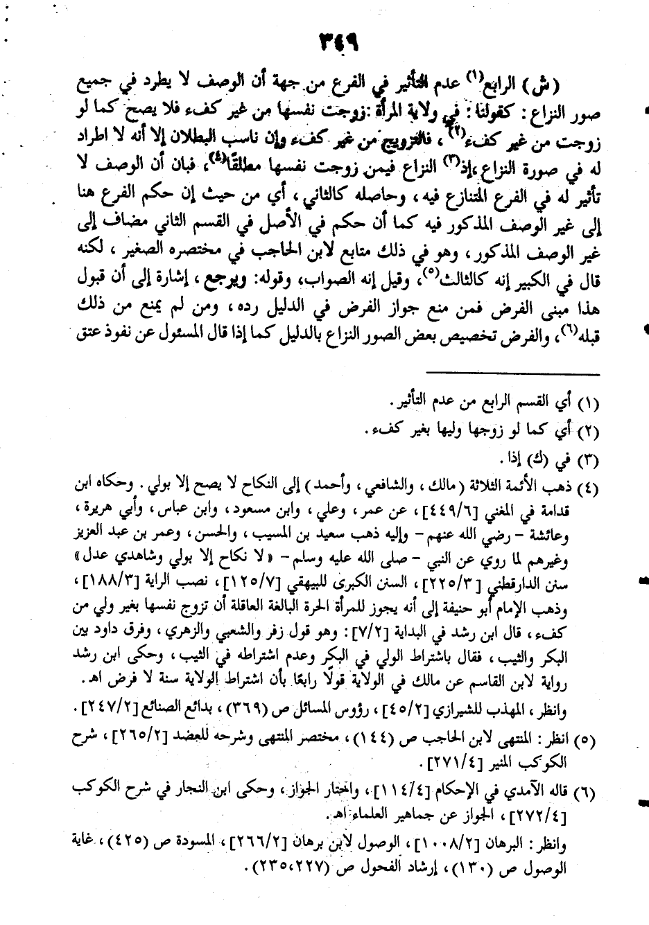 (ش): الرابع عدم التأثير في الفرع من جهة أن الوصف لا يطرد في جميع صور النزاع، كقولنا: في ولاية المرأة: زوجت نفسها من كفء فلا يصح كما لو زوجت من غير كفء، فالتزويج من غير كفء وإن ناسب البطلان إلا أنه لا اطراد له في صورة النزاع إذ النزاع فيمن زوجت نفسها مطلقاً فبان أن الوصف لا تأثير له في الفرع المتنازع فيه، وحاصله كالثاني، أي من حيث إن حكم الفرع هنا إلى غير الوصف المذكور فيه كما أن حكم في الأصل= في القسم الثاني مضاف إلى غير الوصف المذكور، وهو في ذلك متابع لابن الحاجب في مختصره الصغير، لكنه قال في الكبير إنه كالثالث، وقيل إنه الصواب، وقوله: ويرجع إشارة إلى أن قبول هذا مبنى الفرض فمن منع جواز الفرض في الدليل رده، ومن لم يمنع من ذلك قبله، والفرض تخصيص بعض الصور النزاع بالدليل كما إذا قال المسؤول عن نفوذ عتق