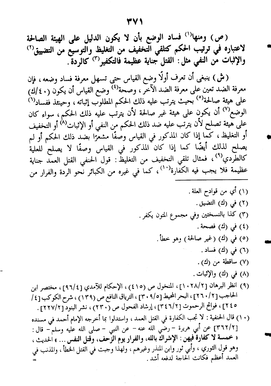 (ش): ينبغي أن تعرف أولاً وضع القياس حتى تسهل معرفة فساد وضعه، فإن معرفة الضد تعين على معرفة الضد الآخر، وصحة وضع القياس أن يكون (٤٠/ك) على هيئة صالحة، بحيث يترتب عليه ذلك الحكم المطلوب إثباته، وحينئذ ففساد الوضع أن يكون على هيئة غير صالحة لأن يترتب عليه ذلك الحكم، سواء كان على هيئة تصلح لأن يترتب عليه ضد ذلك الحكم من النفي أو الإثبات أو التخفيف أو التغليظ كما إذا كان المذكور في القياس وصفاً مشعراً بضد ذلك الحكم أو لم يصلح لذلك أيضاً كما إذا كان المذكور في القياس وصفاً لا يصلح للعلية كالطردي فمثال تلقي التخفيف من التغليظ: قول الحنفي القتل العمد جناية عظيمة فلا يجب فيه الكفارة، كما في غيره من الكبائر نحو الردة والفرار من