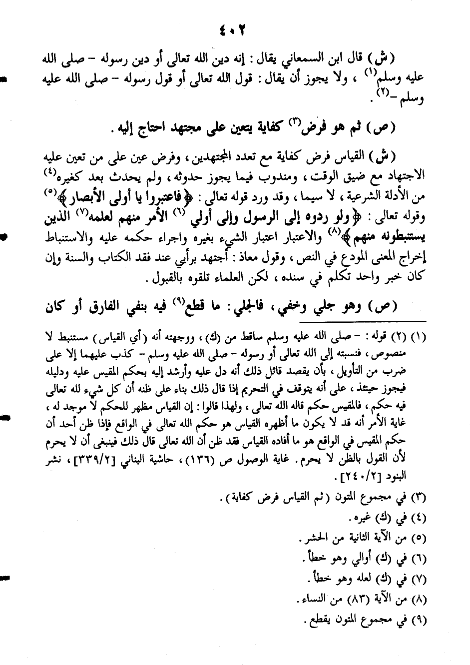 (ش): القياس فرض كفاية مع تعدد المجتهدين، وفرض عين على من تعين عليه الاجتهاد مع ضيق الوقت، ومندوب فيما يجوز حدوثه، ولم يحدث بعد كغيره من الأدلة الشرعية، لا سيما، وقد ورد قوله تعالى: {فاعتبروا يا أولي الأبصار} وقوله تعالى: {ولو ردوه إلى الرسول وإلى أولي الأمر منهم لعلمه الذين يستنبطونه منهم} والاعتبار اعتبار الشيء بغيره واجراء حكمه عليه والاستنباط إخراج المعنى المودع في النص، وقول معاذ: أجتهد برأيي عند فقد الكتاب والسنة وإن كان خبر واحد تكلم في سنده، لكن العلماء تلقوه بالقبول.