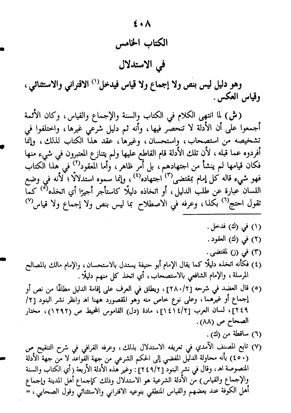 (ش): لما انتهى الكلام في الكتاب والسنة والإجماع والقياس، وكان الأئمة أجمعوا على أن الأدلة لا تنحصر فيها، وأنه ثم دليل شرعي غيرها، واختلفوا في تشخيصه من استصحاب واستحسان، وغيرها، عقد هذا الكتاب لذلك، وإنما أفردوه عما قبله، لأن تلك الأدلة قام القاطع عليها ولم يتنازع المعتبرون في شيء منها فكان قيامها لم ينشأ من اجتهادهم، بل أمر ظاهر، وأما المعقود في هذا الكتاب فهو شيء قاله كل إمام بمقتضى اجتهاده وإنما سمعوه استدلالاً، لأنه في وضع اللسان عبارة عن طلب الدليل، أو اتخاذه دليلاً كاستأجر أجيراً أي اتخذه كما تقول احتج بكذا، وعرفه في الاصطلاح بما ليس بنص ولا إجماع ولا قياس