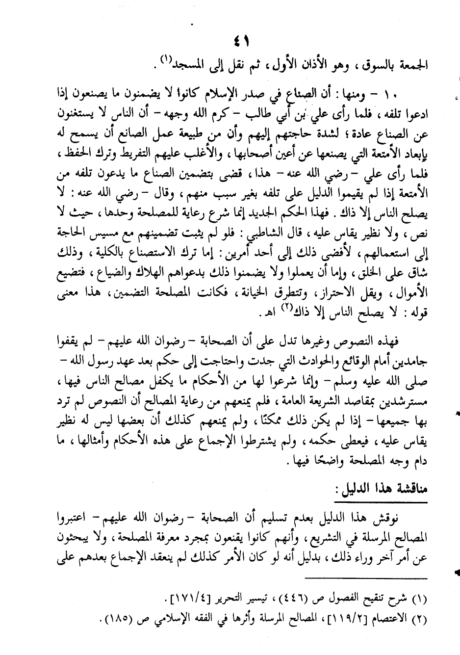 ١٠ - ومنها: أن الصناع في صدر الإسلام كانوا لا يضمنون ما يصنعون إذا ادعوا تلفه، فلما رأى على بن أبي طالب كرم الله وجهه أن الناس لا يستغنون عن الصناع عادة، لشدة حاجتهم إليهم وأن من طبيعة عمل الصانع أن يسمح له بإبعاد الأمتعة التي يصنعها عن أعين أصحابها، والأغلب عليهم التفريط وترك الحفظ، فلما رأى علي رضي الله عنه هذا، قضى بتضمين الصناع ما يدعون تلفه من الأمتعة إذا لم يقيموا الدليل على تلفه بغير سبب منهم، وقال رضي الله عنه: لا يصلح الناس إلا ذاك، فهذا الحكم الجديد إنما شرع رعاية للمصلحة وحدها، حيث لا نص، ولا نظير يقاس عليه، قال الشاطبي: فلو لم يثبت تضمينهم مع مسيس الحاجة إلى استعمالهم، لأفضى ذلك إلى أحد أمرين: إما ترك الاستصناع بالكلية، وذلك شاق على الخلق، وإما أن يعملوا ولا يضمنوا ذلك بدعواهم الهلاك والضياع، فتضيع الأموال، ويقل الاحتراز، وتتطرق الخيانة، فكانت المصلحة التضمين، هذا معنى قوله: لا يصلح الناس إلا ذاك اهـ.