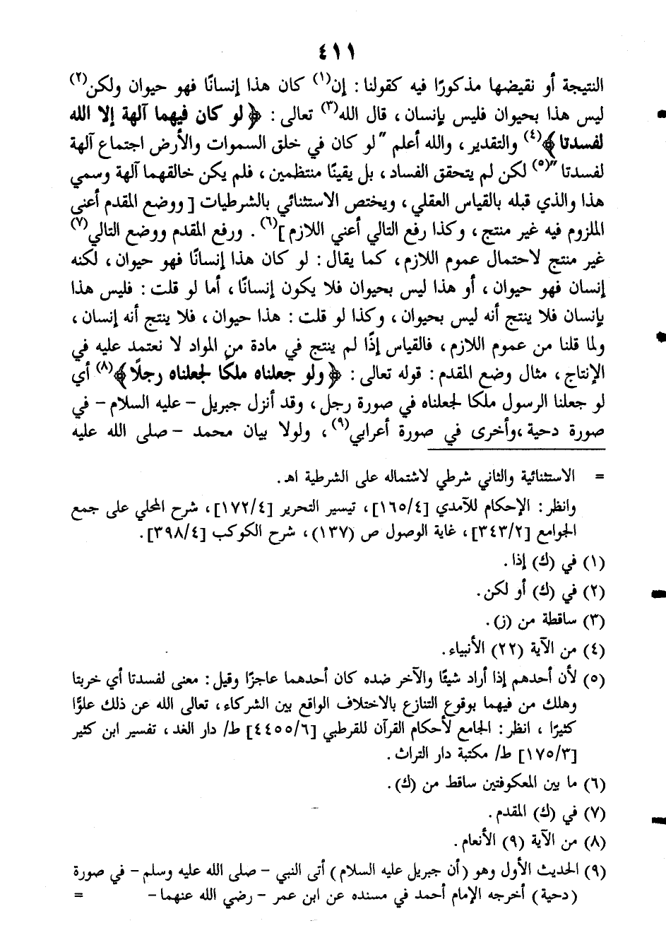 النتيجة أو نقيضها مذكوراً فيه كقولنا: إن كان هذا إنساناً فهو حيوان ولكن ليس هذا بحيوان فليس بإنسان، قال الله تعالى: {لو كان فيهما آلهة إلا الله لفسدتا} والتقدير، والله أعلم (لو كان في خلق السماوات والأرض اجتماع آلهة لفسدتا لكن لم يتحقق الفساد، بل يقينا منتظمين، فلم يكن خالقهما آلهة وسمي هذا والذي قبله بالقياس العقلي، ويختص الاستثنائي بالشرطيات (ووضع المقدم أعني الملزوم فيه غير منتج، وكذا رفع التالي أعني اللازم) ورفع المقدم ووضع التالي غير منتج لاحتمال عموم اللازم، كما يقال: لو كان هذا إنساناً فهو حيوان، لكنه إنسان فهو حيوان، أو هذا ليس بحيوان فلا يكون إنساناً، أما لو قلت: فليس هذا بإنسان فلا ينتج أنه ليس بحيوان، وكذا لو قلت: هذا حيوان، فلا ينتج أنه إنسان، ولما قلنا من عموم اللازم، فالقياس إذاً لم ينتج في مادة من المواد لا نعتمد عليه في
