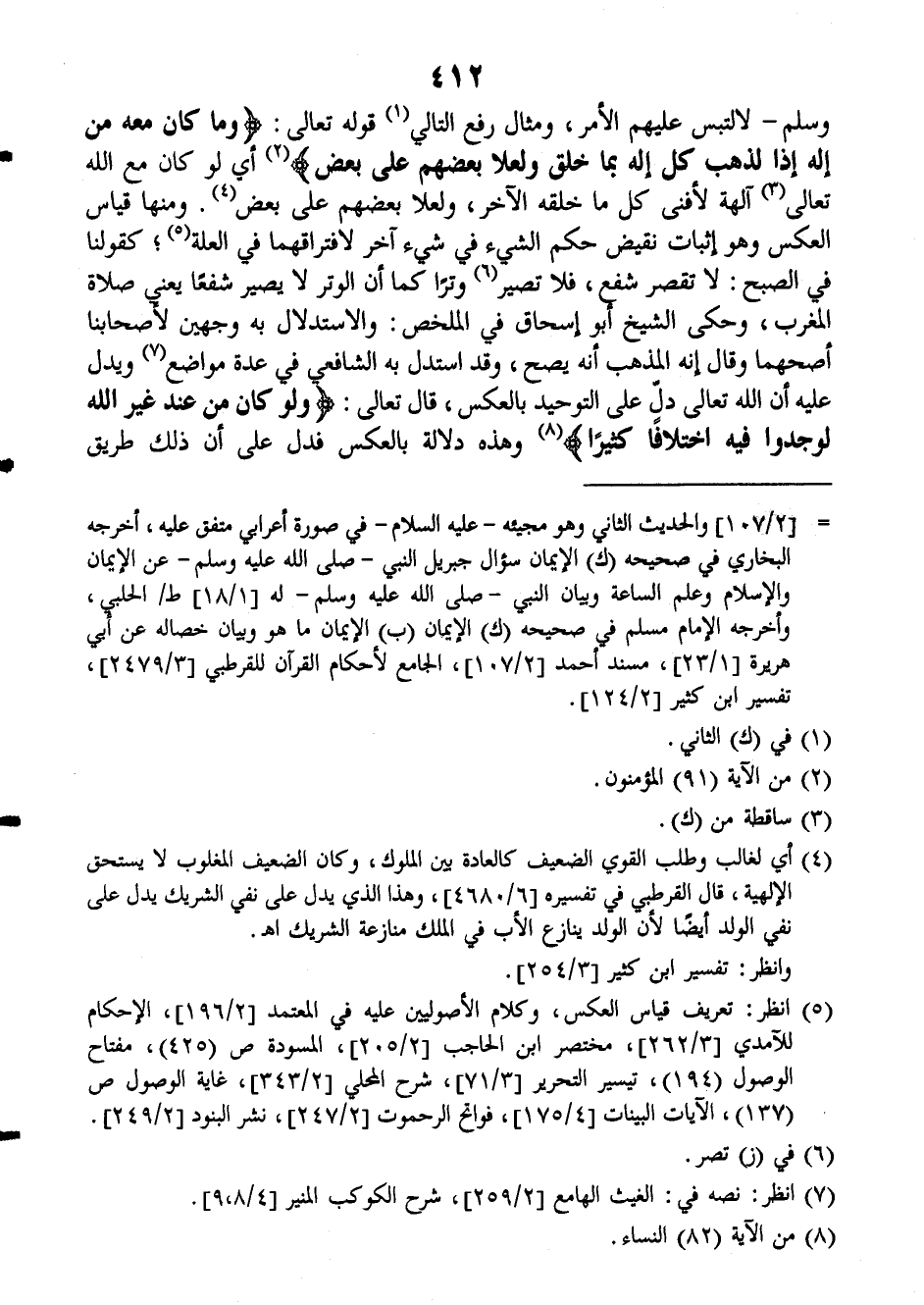 وسلم لالتبس عليهم الأمر، ومثال رفع التالي قوله تعالى: {وما كان معه من إله إذا لذهب كل إله بما خلق ولعلا بعضهم على بعض} أي لو كان مع الله تعالى آلهة لأفنى كل ما خلقه الآخر، ولعلا بعضهم على بعض، ومنها قياس العكس وهو إثبات نقيض حكم الشيء في شيء آخر لافتراقهما في العلة، كقولنا في الصبح: لا تقصر شفع فلا تصير وتراً كما أن الوتر لا يصير شفعاً يعني صلاة المغرب، وحكى الشيخ أبو إسحاق في (الملخص): والاستدلال به وجهين لأصحابنا أصحهما وقال إنه المذهب أنه يصح، وقد استدل به الشافعي في عدة مواضع ويدل عليه أن الله تعالى دل على التوحيد بالعكس، قال تعالى: {ولو كان من عند غير الله لوجدوا فيه اختلافاً كثيراً} وهذه دلالة بالعكس فدل على أن ذلك طريق
