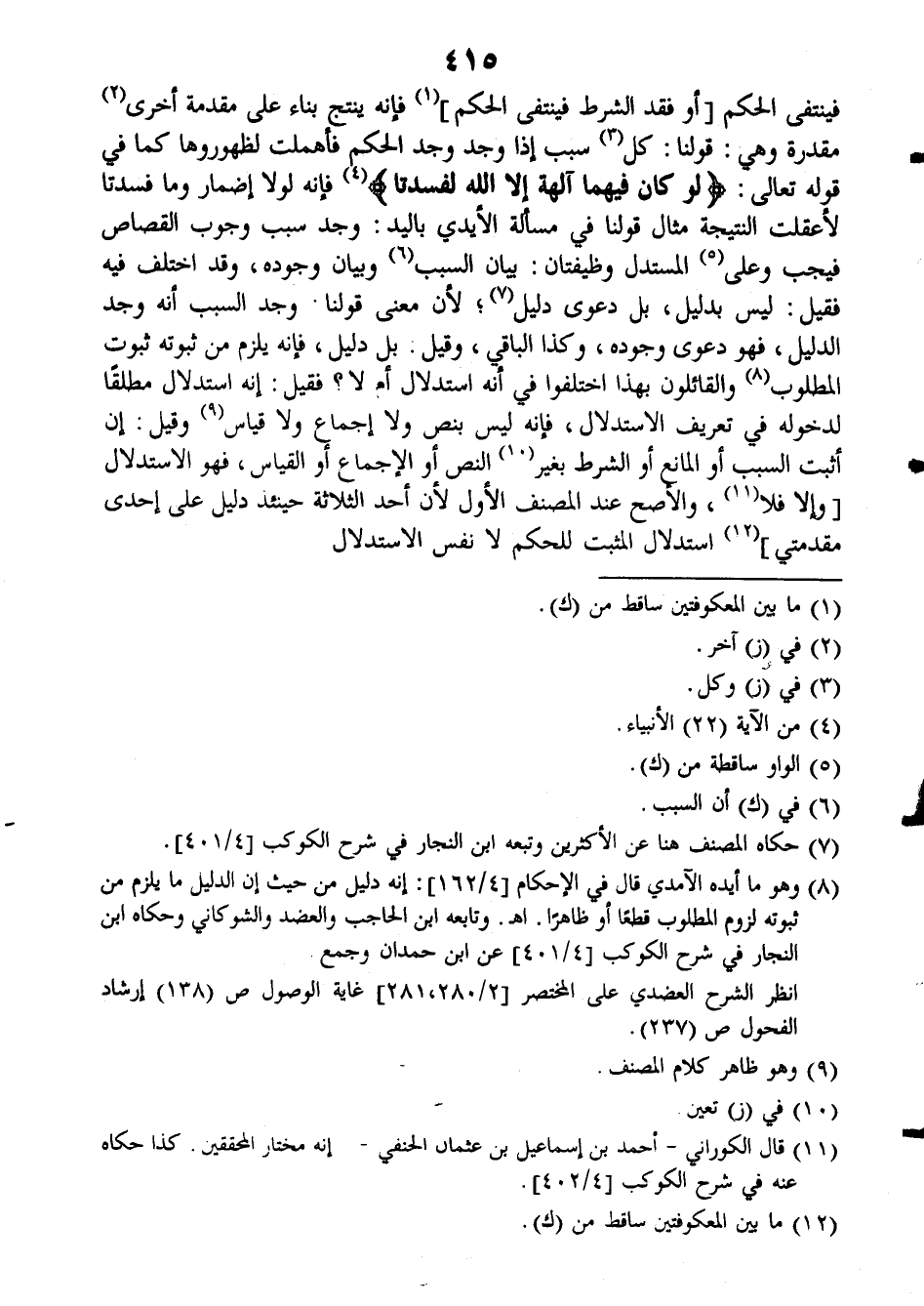 فينتفي الحكم (أو فقد الشرط فينتفي الحكم) فإنه ينتج بناء على مقدمة أخرى مقدرة وهي: قولنا: كل سبب إذا وجد وجد الحكم فأهملت لظهوروها= كما في قوله تعالى: {لو كان فيهما آلهة إلا الله لفسدتا} فإنه لولا إضمار وما فسدتا لأعقلت النتيجة مثال قولنا في مسألة الأيدي باليد: وجد سبب وجوب القصاص فيجب وعلى المستدل وظيفتان: بيان السبب وبيان وجوده، وقد اختلف فيه فقيل: ليس بدليل، بل دعوى دليل، لأن معنى قولنا: وجد السبب أنه وجد الدليل، فهو دعوى وجوده، وكذا الباقي، وقيل: بل دليل، فإنه يلزم من ثبوته ثبوت المطلوب والقائلون بهذا اختلفوا في أنه استدلال أم لا؟ فقيل: إنه استدلال مطلقاً لدخوله في تعريف الاستدلال، فإنه ليس بنص ولا إجماع ولا قياس وقيل: إن أثبت السبب أو المانع أو الشرط بغير النص أو الإجماع أو القياس، فهو الاستدلال وإلا فلا والأصح عند المصنف الأول لأن أحد الثلاثة حينئذ دليل على إحدى مقدمتي) استدلال المثبت للحكم لا نفس الاستدلال.