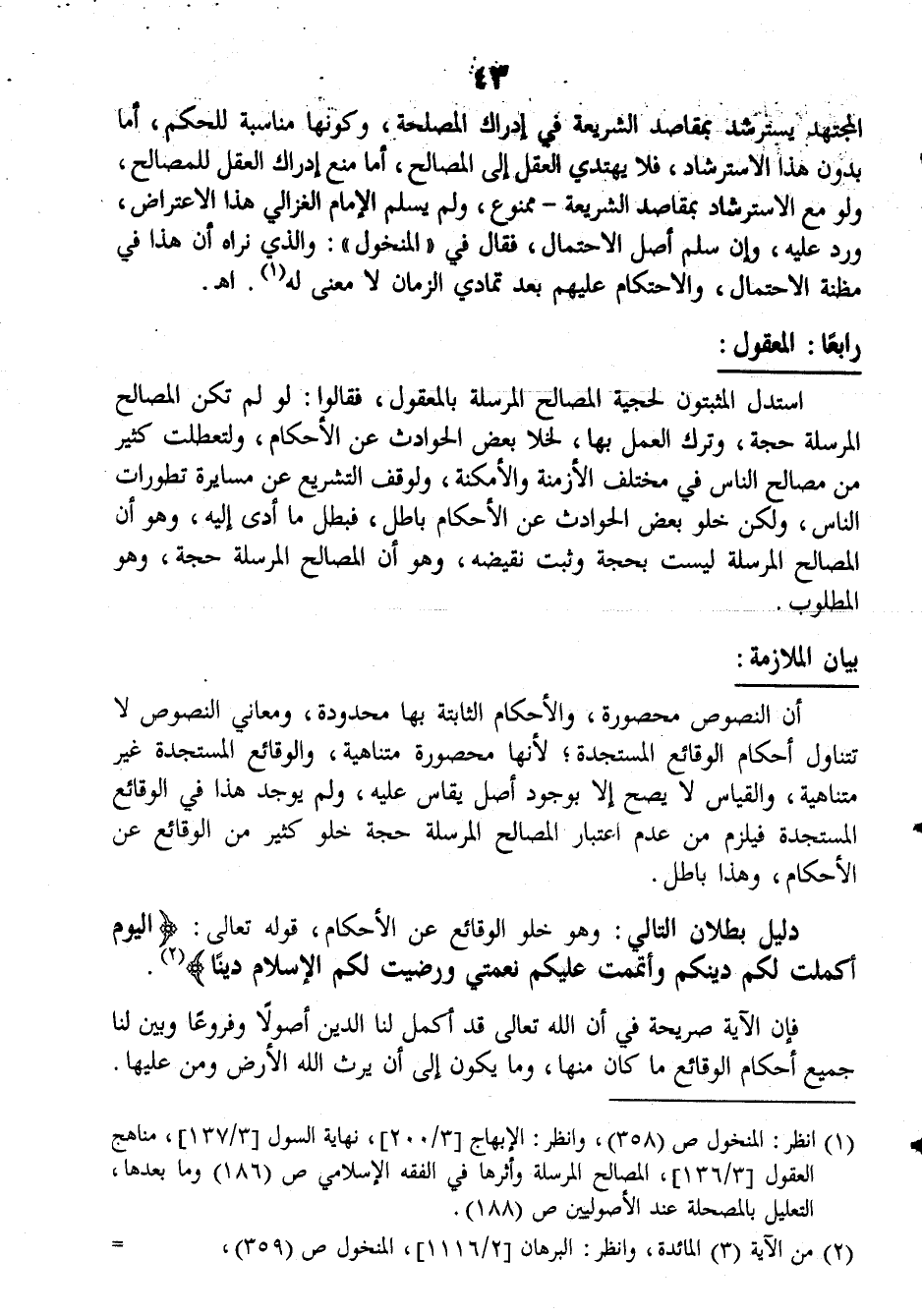 المجتهد يسترشد بمقاصد الشريعة في إدراك المصلحة، وكونها مناسبة للحكم، أما بدون هذا الاسترشاد فلا يهتدي العقل إلى المصالح، أما منع إدراك العقل للمصالح، ولو مع الاسترشاد بمقاصد الشريعة ـ ممنوع، ولم يسلم الإمام الغزالي هذا الاعتراض ورد عليه، وإن سلم أصل الاحتمال، فقال في (المنخول): والذي نراه أن هذا في مظنة الاحتمال، والاحتكام عليهم بعد تمادي الزمان لا معنى له. اهـ.