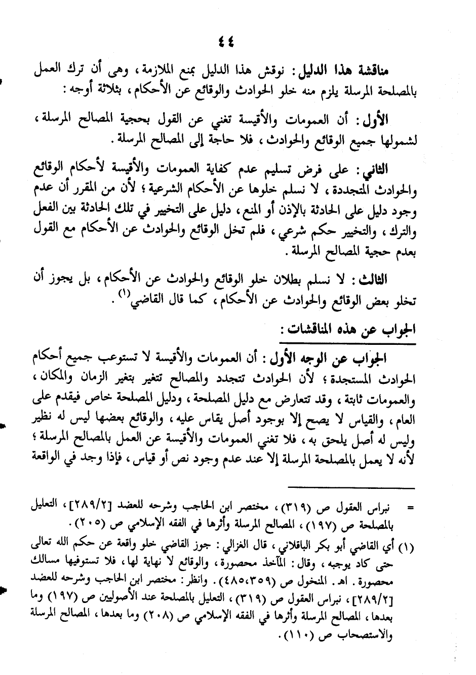 الجواب عن الوجه الأول: أن العمومات والأقيسة لا تستوعب جميع أحكام الحوادث المستجدة، لأن الحوادث تتجدد والمصالح تتغير بتغير الزمان والمكان، والعمومات ثابتة وقد تتعارض مع دليل المصلحة، ودليل المصلحة خاص فيقدم على العام والقياس لا يصح إلا بوجود أصل يقاس عليه، والوقائع بعضها ليس له نظير وليس له أصل يلحق به، فلا تغني العمومات والأقيسة عن العمل بالمصالح المرسلة، لأنه لا يعمل بالمصلحة المرسلة إلا عند عدم وجود نص أو قياس، فإذا وجد في الواقعة