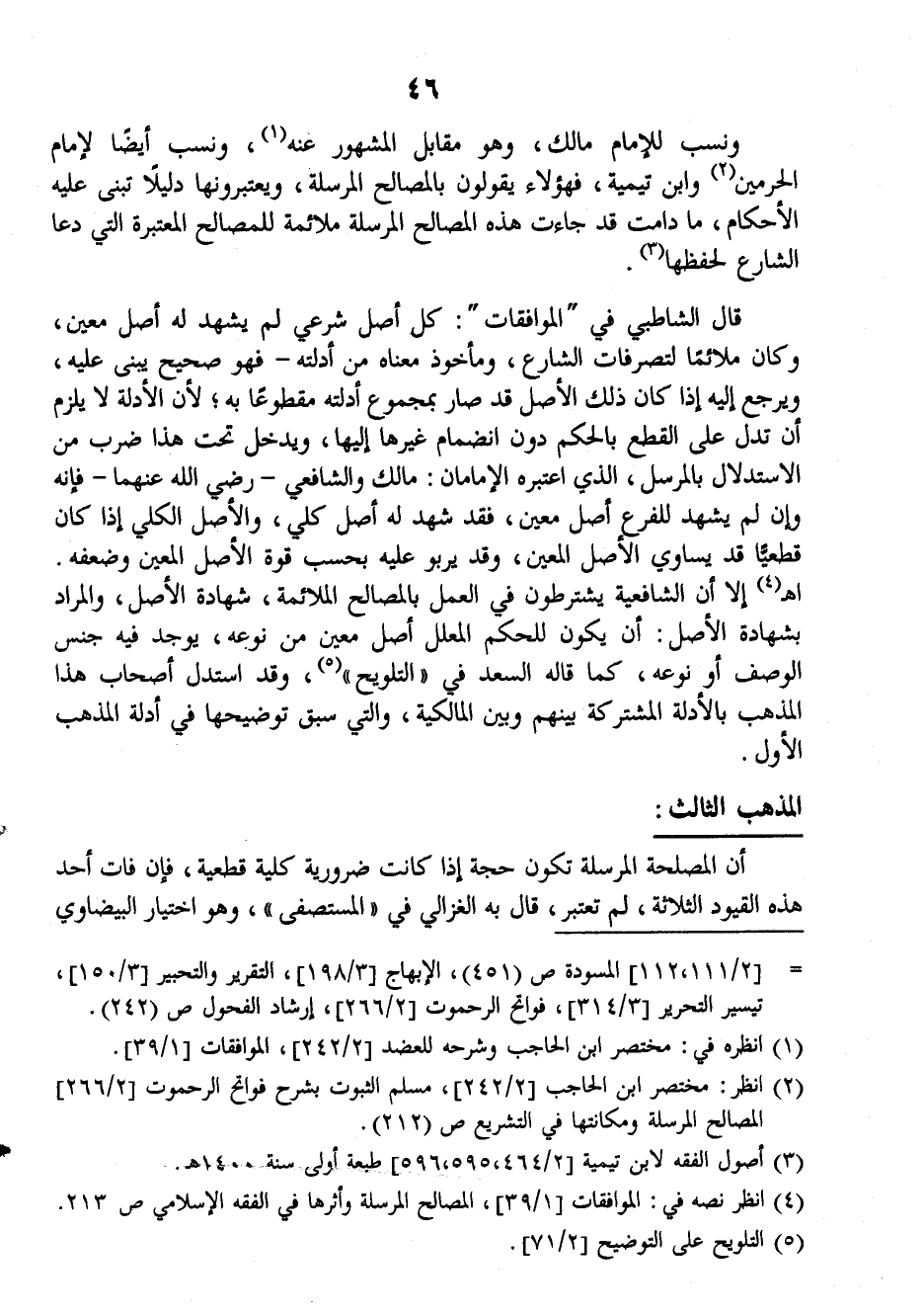 قال الشاطبي في (الموافقات) كل أصل شرعي لم يشهد له أصل معين، وكان ملائماً لتصرفات الشارع، ومأخوذ معناه من أدلته ـ فهو صحيح يبنى عليه، ويرجع إليه إذا كان ذلك الأصل قد صار بمجموع أدلته مقطوعاً به، لأن الأدلة لا يلزم أن تدل على القطع بالحكم دون انضمام غيرها إليها، ويدخل تحت هذا ضرب من الاستدلال بالمرسل، الذي اعتبره الإمامان: مالك والشافعي رضي الله عنهما فإنه وإن لم يشهد للفرع أصل معين، فقد شهد له أصل كلي، والأصل الكلي إذا كان قطعياً قد يساوي الأصل المعين، وقد يربو عليه بحسب قوة الأصل المعين وضعفه. اهـ. إلا أن الشافعية يشترطون في العمل بالمصالح الملائمة، شهادة الأصل، والمراد بشهادة الأصل: أن يكون للحكم المعلل أصل معين من نوعه، يوجد فيه جنس الوصف أو نوعه، كما قال السعد في (التلويح) وقد استدل أصحاب هذا المذهب بالأدلة المشتركة بينهم وبين المالكية، والتي سبق توضيحها في أدلة المذهب الأول.