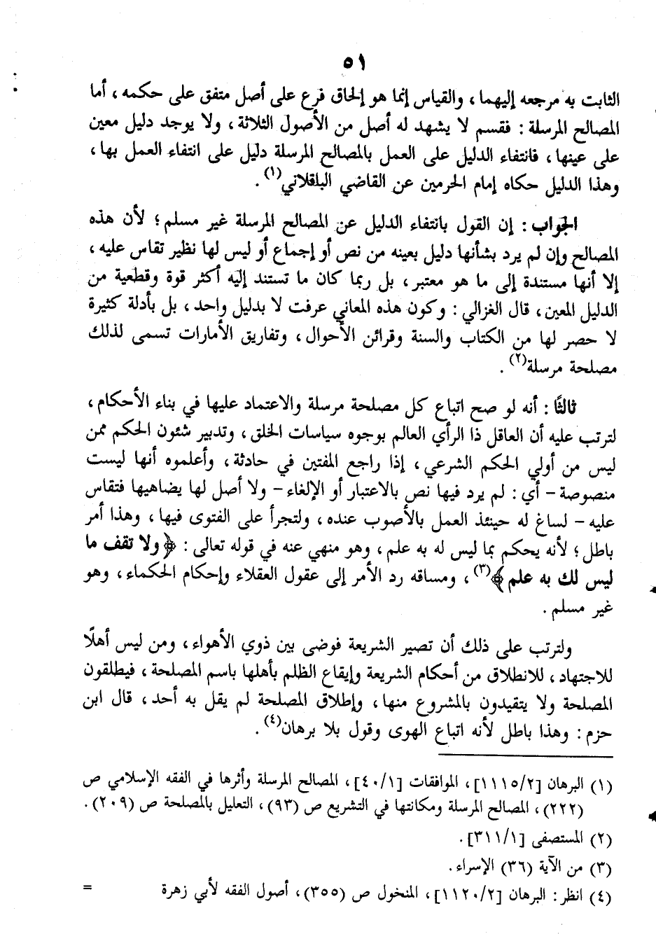 ثالثاً: أنه لو صح اتباع كل مصلحة مرسلة والاعتماد عليها في بناء الأحكام، لترتب عليه أن العاقل ذا الرأي العالم بوجوه سياسات الخلق، وتدبير شؤون الحكم ممن ليس من أولي الحكم الشرعي، إذا راجع المفتين في حادثة، وأعلموه أنها ليست منصوصة ـ أي: لم يرد فيها نص بالاعتبار أو الإلغاء ـ ولا أصل لها يضاهيها فتقاس عليه ـ لساغ له حينئذ العمل بالأصوب عنده، ولتجرأ على الفتوى فيها، وهذا أمر باطل، لأنه يحكم بما ليس له به علم، وهو منهي عنه في قوله تعالى: {ولا تقف ما ليس لك به علم} ومساقه رد الأمر إلى عقول العقلاء وإحكام الحكماء، وهو غير مسلم.