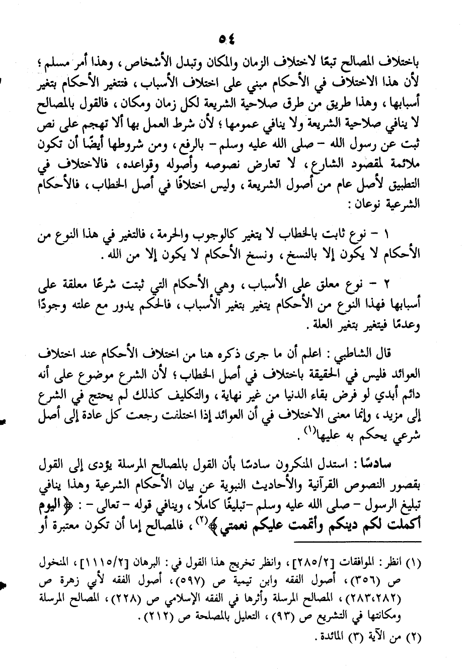باختلاف المصالح تبعاً لاختلاف الزمان والمكان وتبدل الأشخاص، وهذا أمر مسلم، لأن هذا الاختلاف في الأحكام مبني على اختلاف الأسباب، فتتغير الأحكام بتغير أسبابها، وهذا طريق من طرق صلاحية الشريعة لكل زمان ومكان، فالقول بالمصالح لا ينافي صلاحية الشريعة ولا ينافي عمومها، لأن شرط العمل بها ألا تهجم على نص ثبت عن رسول الله صَلَّى اللهُ عَلَيْهِ وَسَلَّمَ بالرفع، ومن شروطها أيضاً أن تكون ملائمة لمقصود الشارع، لا تعارض نصوصه وأصوله وقواعده، فالاختلاف في التطبيق لأصل عام من أصول الشريعة، وليس اختلافاً في أصل الخطاب، فالأحكام الشرعية نوعان:
