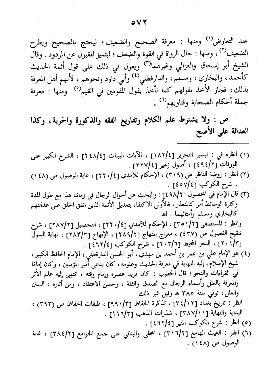 عند التعارض ومنها: معرفة الصحيح والضعيف، ليحتج بالصحيح ويطرح الضعيف، ومنها: حال الرواة في القوة والضعف، ليتميز المقبول عن المردود. وقال الشيخ أبو إسحاق والغزالي وغيرهما، ويعول في ذلك على قول أئمة الحديث كأحمد والبخاري ومسلم والدارقطني، وأبي داود ونحوهم، لأنهم أهل المعرفة بذلك، فجاز الأخذ بقولهم كما نأخذ بقول المقومين في القيم، ومنها: معرفة جملة أحكام الصحابة وفتاويهم.