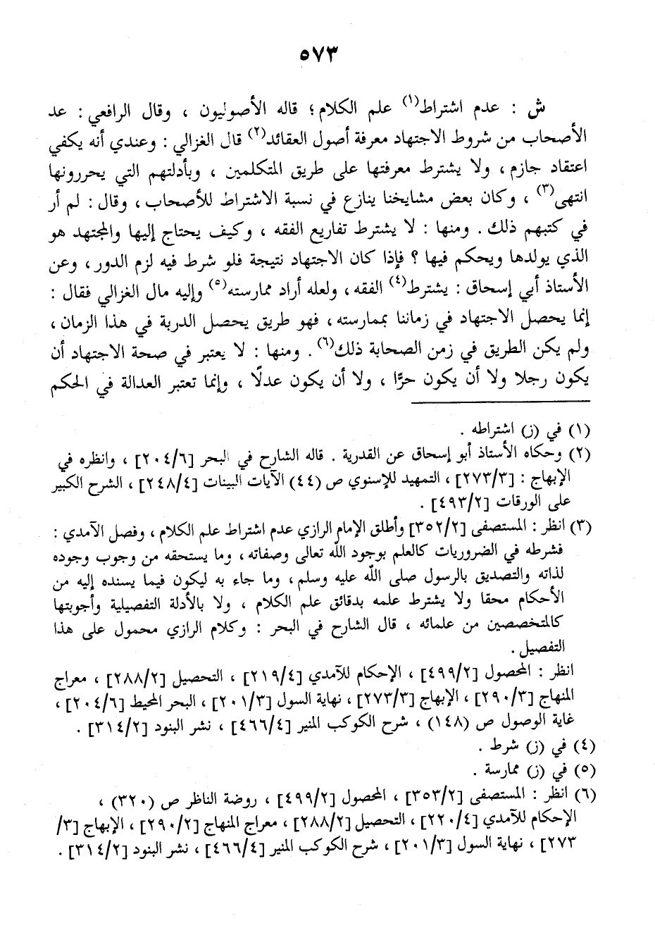 ش: عدم اشتراط علم الكلام، قاله الأصوليون، وقال الرافعي: عد الأصحاب من شروط الاجتهاد معرفة أصول العقائد قال الغزالي: وعندي أنه يكفي اعتقاد جازم، ولا يشترط معرفتها على طريق المتكلمين، وبأدلتهم التي يحررونها انتهى. وكان بعض مشايخنا ينازع في نسبة الاشتراط للأصحاب، وقال: لم أر في كتبهم ذلك. ومنها: لا يشترط تفاريع الفقه، وكيف يحتاج إليها والمجتهد هو الذي يولدها ويحكم فيها؟ فإذا كان الاجتهاد نتيجة فلو شرط فيه لزم الدور، وعن الأستاذ أبي إسحاق: يشترط الفقه، ولعله أراد ممارسته وإليه مال الغزالي فقال: إنما يحصل الاجتهاد في زماننا بممارسته فهو طريق يحصل الدربة في هذا الزمان، ولم يكن الطريق في زمن الصحابة ذلك. ومنها: لا يعتبر في صحة الاجتهاد أن يكون رجلا ولا أن يكون حرا، ولا أن يكون عدلا، وإنما تعتبر العدالة في الحكم