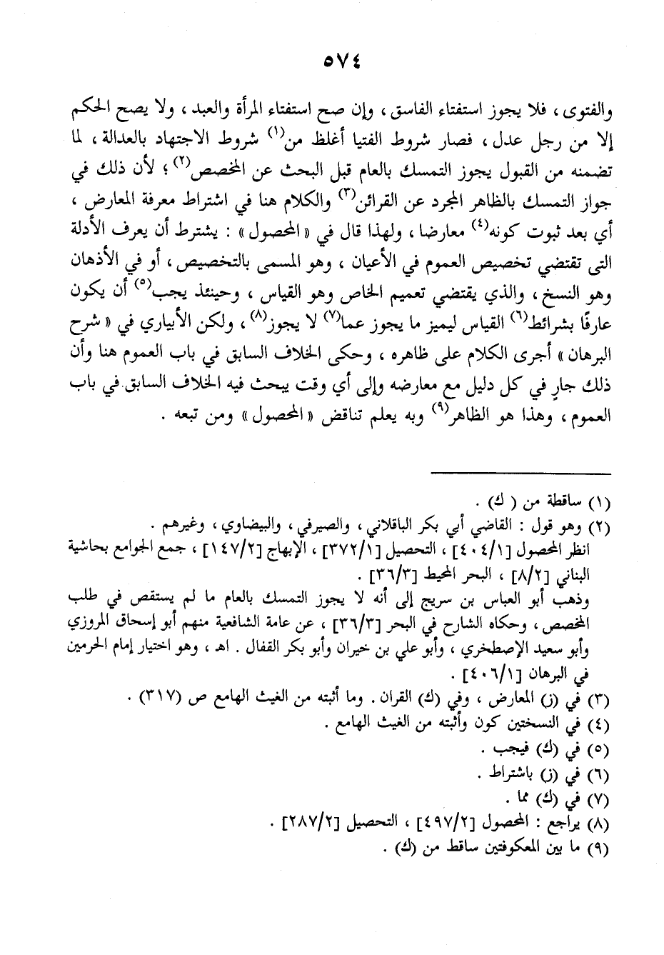 والفتوى فلا يجوز استفتاء الفاسق، وإن صح استفتاء المرأة والعبد، ولا يصح الحكم إلا من رجل عدل، فصار= شروط الفتيا أغلظ من شروط الاجتهاد بالعدالة، لما تضمنه من القبول يجوز التمسك بالعام قبل البحث عن المخصص، لأن ذلك في جواز التمسك بالظاهر المجرد عن القرائن والكلام هنا في اشتراط معرفة المعارض أي بعد ثبوت كونه معارضا، ولهذا قال في (المحصول): يشترط أن يعرف الأدلة التي تقتضي تخصيص العموم في الأعيان، وهو المسمى بالتخصيص، أو في الأذهان وهو النسخ، والذي يقتضي تعميم الخاص وهو القياس، وحينئذ يجب أن يكون عارفا بشرائط القياس ليميز ما يجوز عما لا يجوز، ولكن الأبياري في (شرح البرهان) أجرى الكلام على ظاهره، وحكى الخلاف السابق في باب العموم هنا وأن ذلك جار في كل دليل مع معارضه، وإلى أي وقت يبحث فيه الخلاف السابق في باب العموم، وهذا هو الظاهر، وبه يعلم تناقض (المحصول) ومن تبعه.