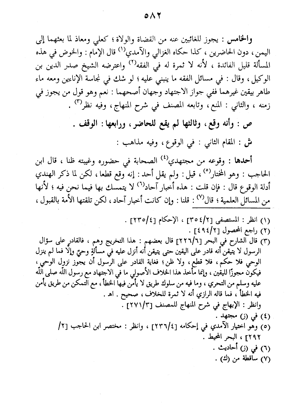 والخامس: يجوز للغائبين عنه من القضاة والولاة، كعلي ومعاذ لما بعثهما إلى اليمن، دون الحاضرين، كذا حكاه الغزالي والآمدي قال الإمام: والخوض في هذه المسألة قليل الفائدة، لأنه لا ثمرة له في الفقه، واعترضه الشيخ صدر الدين بن الوكيل، وقال: في مسائل الفقه ما ينبني عليه، لو شك في نجاسة الإناءين ومعه ماء طاهر بيقين غيرهما ففي جواز الاجتهاد وجهان أصحهما: نعم وهو قول من يجوز في زمنه، والثاني: المنع، وتابعه المصنف في (شرح المنهاج)، وفيه نظر.