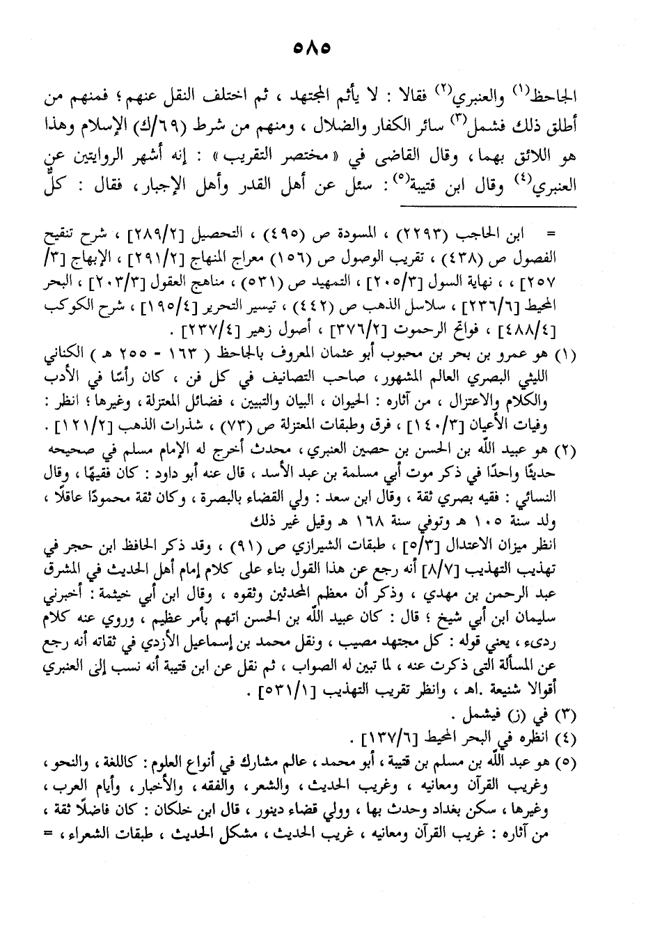 الجاحظ والعنبري فقالا: لا يأثم المجتهد، ثم اختلف النقل عنهم فمنهم من أطلق ذلك فشمل سائر الكفار والضلال، ومنهم من شرط (٦٩/ك) الإسلام وهذا هو اللائق بهما، وقال القاضي في (مختصر التقريب): إنه أشهر الروايتين عن العنبري وقال ابن قتيبة: سئل عن أهل القدر وأهل الإجبار، فقال: كل