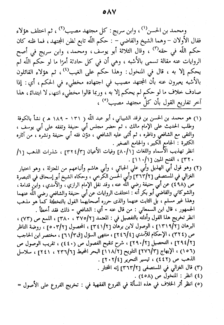 ومحمد بن الحسن وابن سريج: كل مجتهد مصيب، ثم اختلف هؤلاء فقال الأولان - وهما الشيخ والقاضي -: حكم الله تابع لظن المجتهد، فما ظنه كان حكم الله في حقه، وقال الثلاثة أبو يوسف، ومحمد، وابن سريج، في أصح الروايات عنه مقالة تسمى بالأشبه وهي أن في كل حادثة أمر ما لو حكم الله لم يحكم إلا به، قال في (المنخول): وهذا حكم على الغيب، ثم هؤلاء القائلون بالأشبه يعبرون عنه بأن المجتهد مصيب في اجتهاده مخطئ في الحكم، أي: إذا صادف خلاف ما لو حكم لم يحكم إلا به، وربما قالوا مخطئ انتهاء لا ابتداء هذا آخر تفاريع القول بأن كل مجتهد مصيب.