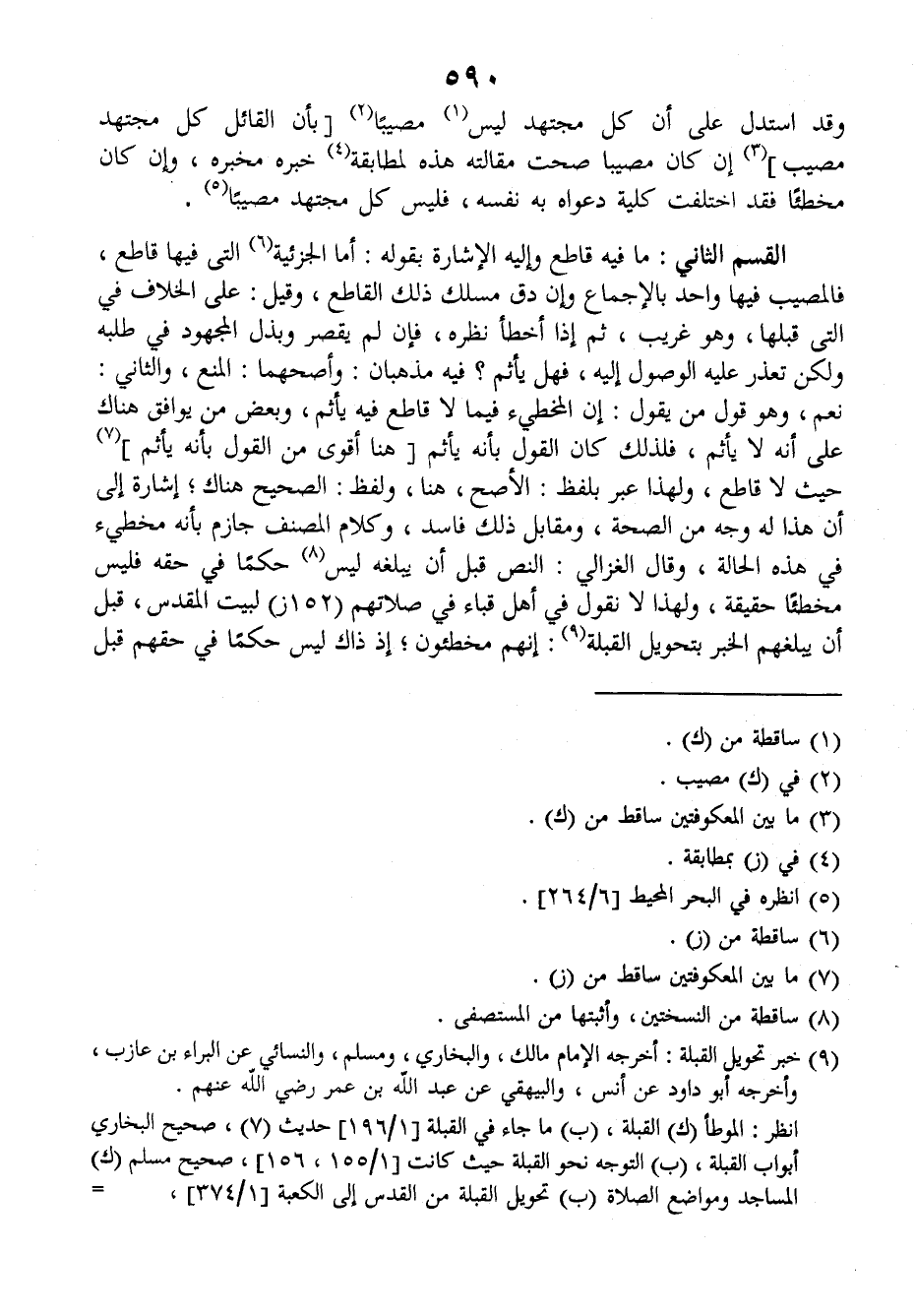 القسم الثاني: ما فيه قاطع وإليه الإشارة بقوله: أما الجزئية التي فيها قاطع فالمصيب فيها واحد بالإجماع وإن دق مسلك ذلك القاطع وقيل: على الخلاف في التي قبلها وهو غريب ثم إذا أخطأ نظره، فإن لم يقصر وبذل المجهود في طلبه ولكن تعذر عليه الوصول إليه، فهل يأثم؟ فيه مذهبان: وأصحهما. المنع: والثاني: نعم وهو قول من يقول: إن المخطئ فيما لا قاطع فيه يأثم، وبعض من يوافق هناك على أنه لا يأثم فلذلك كان القول بأنه يأثم (هنا أقوى من القول بأنه يأثم) حيث لا قاطع، ولهذا عبر بلفظ: الأصح هنا، ولفظ: الصحيح هناك إشارة إلى أن هذا له وجه من الصحة، ومقابل ذلك فاسد، وكلام المصنف جازم بأنه مخطئ في هذه الحالة، وقال الغزالي: النص قبل أن يبلغه ليس حكما في حقه فليس مخطئا حقيقة ولهذا لا نقول في أهل قباء في صلاتهم (١٥٢ز) لبيت المقدس، قبل أن يبلغهم الخبر بتحويل القبلة: إنهم مخطئون إذ ذاك ليس حكما في حقهم قبل