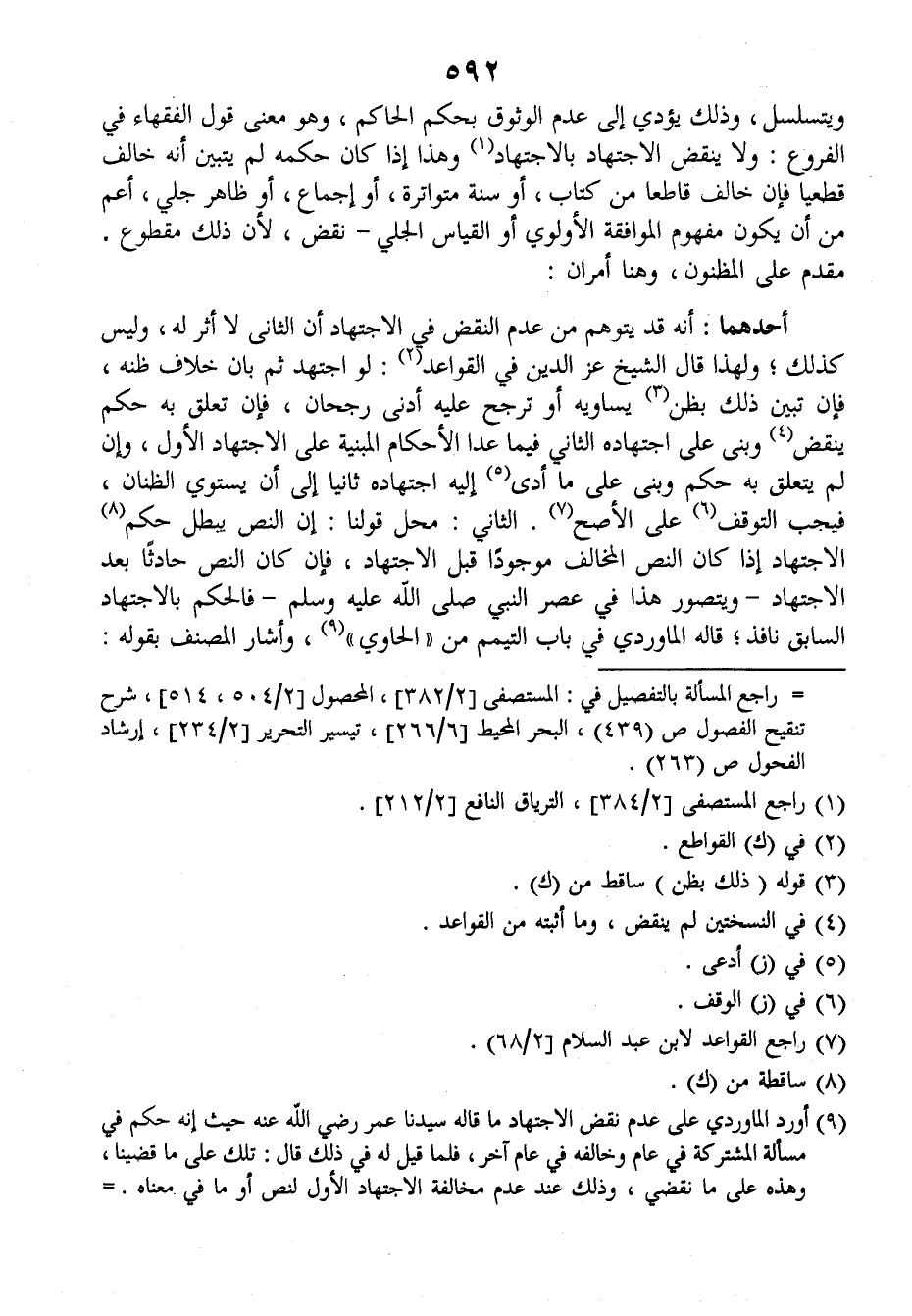 ويتسلسل وذلك يؤدي إلى عدم الوثوق بحكم الحاكم، وهو معنى قول الفقهاء في الفروع: ولا ينقض الاجتهاد بالاجتهاد، وهذا إذا كان حكمه لم يتبين أنه خالف قطعيا فإن خالف قاطعا من كتاب، أو سنة متواترة، أو إجماع، أو ظاهر جلي، أعم من أن يكون مفهوم الموافقة الأولوي أو القياس الجلي - نقض، لأن ذلك مقطوع، مقدم على المظنون، وهنا أمران: