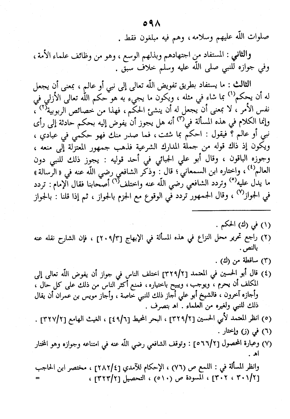 الثالث: ما يستفاد بطريق تفويض الله تعالى إلى نبي أو عالم، بمعنى أن يجعل له أن يحكم بما شاء في مثله، ويكون ما يجيء به هو حكم الله تعالى الأزلي في نفس الأمر، لا بمعنى أن يجعل له أن ينشئ الحكم، فهذا من خصائص الربوبية وإنما الكلام في هذه المسألة في أنه هل يجوز أن يفوض إليه بحكم حادثة إلى رأي نبي أو عالم؟ فيقول: احكم بما شئت، فما صدر منك فهو حكمي في عبادي، ويكون إذ ذاك قوله من جملة المدارك الشرعية فذهب جمهور المعتزلة إلى منعه، وجوزه الباقون، وقال أبو علي الجبائي في أحد قوليه: يجوز ذلك للنبي دون العالم واختاره ابن السمعاني، قال: وذكر الشافعي رضي الله عنه في (الرسالة) ما يدل عليه وتردد الشافعي رضي الله عنه واختلف أصحابنا فقال الإمام: تردد في الجواز وقال الجمهور تردد في الوقوع مع الجزم بالجواز، ثم إذا قلنا: بالجواز