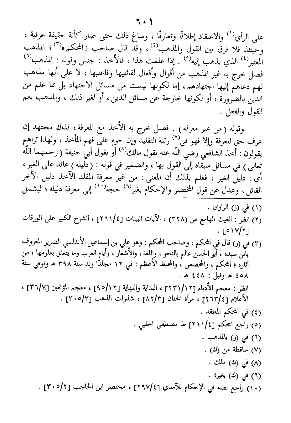 وقوله: (من غير معرفة). فصل خرج به الأخذ مع المعرفة، فذاك مجتهد إن عرف حق المعرفة وإلا فهو في رتبة التقليد وإن حوم على فهم المأخذ، ولهذا تراهم يقولون: أخذ الشافعي رضي الله عنه بقول مالك أو بقول أبي حنيفة (رحمهما الله تعالى) في مسائل سبقاه إلى القول بها، والضمير في قوله: (دليله) عائد على الغير أي: دليل الغير، فعلم بذلك أن المعنى: من غير معرفة المقلد الآخذ دليل الآخر القائل وعدل عن قول المختصر والإحكام بغير حجة، إلى معرفة دليله، ليشمل