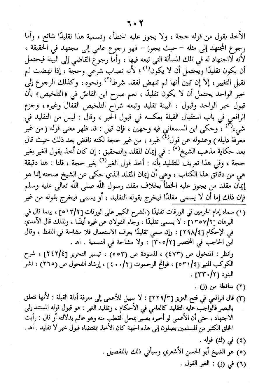 الأخذ بقول من قوله حجة، ولا يجوز عليه الخطأ وتسمية هذا تقليدا شائع، وأما رجوع المجتهد إلى مثله - حيث يجوز - فهو رجوع عامي إلى مجتهد في الحقيقة لأنه لا اجتهاد له في تلك المسألة التي تبعه فيها، وأما رجوع القاضي إلى البينة فيحتمل أن يكون تقليدا ويحتمل أن لا يكون لأنه نصاب شرعي وحجة، إذا نهضت لم تقبل التغيير، إلا إن تبين أنها لم تنهض لفقد شرط ونحوه، وكذلك الرجوع إلى خبر الواحد يحتمل أن لا يكون تقليدا، نعم صرح ابن القاص في (التخليص) بأن قبول خبر الواحد وقبول البينة تقليد وتبعه شراح (التلخيص) القفال وغيره، وجزم الرافعي في باب استقبال القبلة بعكسه في قبول الخبر، وقال: ليس من التقليد في شيء وحكى ابن السمعاني فيه وجهين، فإن قيل: قد ظهر معنى قوله (من غير معرفة دليله) وعدوله عن قول غيره، من غير حجة لكنه ناقض بعد ذلك حيث قال بعد حكاية مذهب الشيخ: في إيمان المقلد والتحقيق: إن كان أخذ بقول الغير بغير حجة، وفي هذا تعريف للتقليد بأنه: أخذ قول الغير بغير حجة، قلنا: هنا دقيقة هي من دقائق هذا الكتاب، وهي أن إيمان المقلد الذي حكى عن الشيخ صحته إنما هو إيمان مقلد من يجوز عليه الخطأ بخلاف مقلد رسول الله صلى الله تعالى عليه وسلم فإن ذلك إما أن لا يسمى مقلدا فيخرج بقوله التقليد، أو يسمى فيخرج بقوله من غير