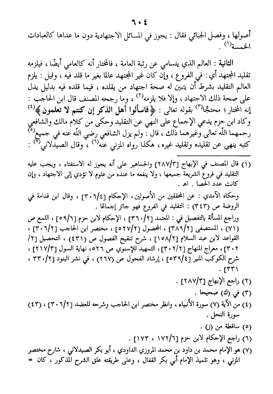 الثانية: العالم الذي يتسامى عن رتبة العامة، فالمختار أنه كالعامي أيضا، فيلزمه تقليد المجتهد أي: في الفروع، وإن كان غير المجتهد عالما بغير ما قلد فيه، وقيل: يلزم العالم التقليد بشرط أن يتبين له صحة اجتهاد من يقلده، فيما قلده فيه بدليل يدل على صحة ذلك الاجتهاد، وإلا فلا يلزمه وما رجحه المصنف قال ابن الحاجب: إنه المختار محتجا بقوله تعالى: {فاسألوا أهل الذكر إن كنتم لا تعلمون} وكاد ابن حزم يدعي الإجماع على النهي عن التقليد وحكى من كلام مالك والشافعي رحمهما الله تعالى وغيرهما ذلك، قال: ولم يزل الشافعي رضي الله عنه في جميع كتبه ينهى عن تقليده وتقليد غيره، هكذا رواه المزني عنه وقال الصيدلاني: