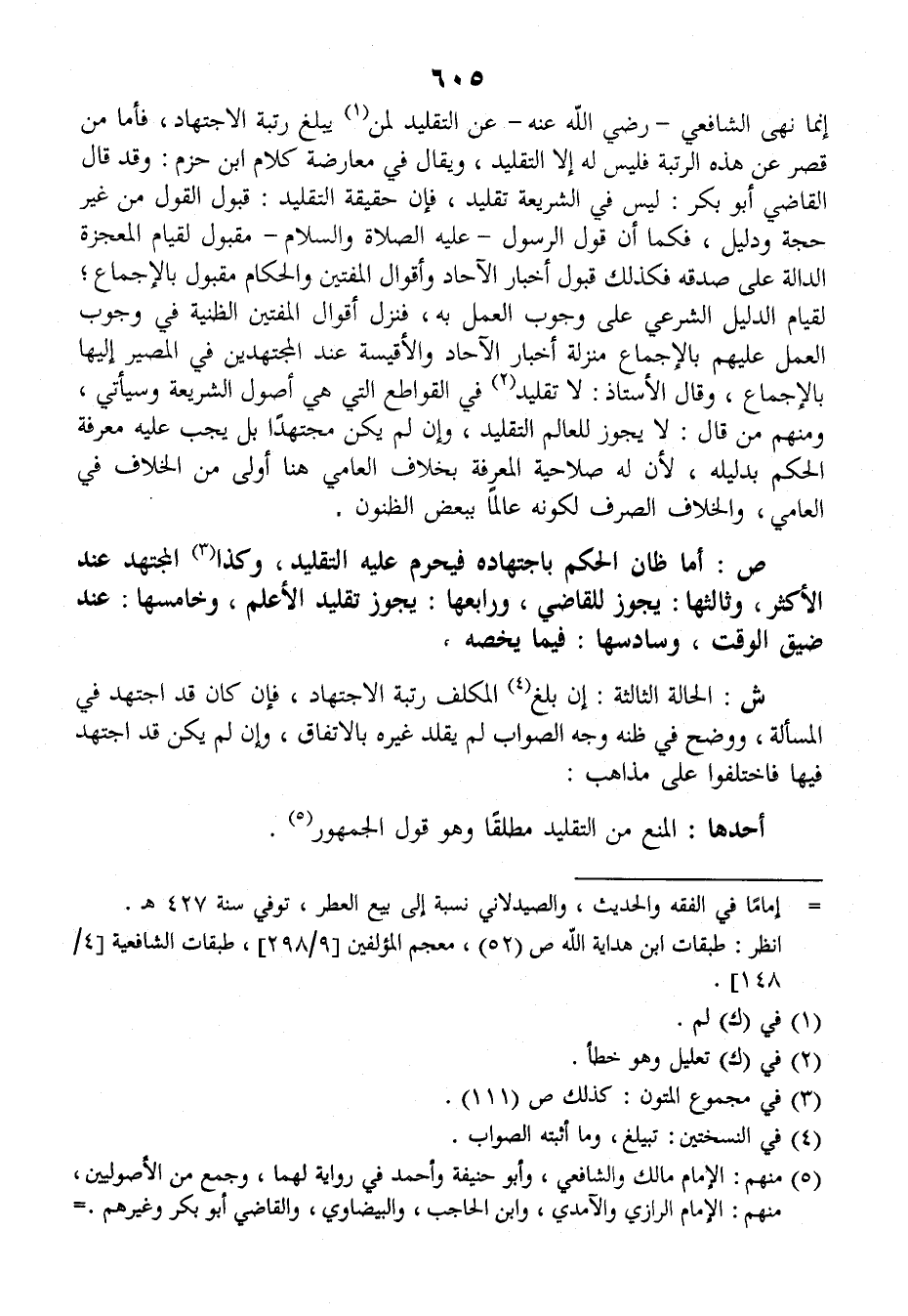إنما نهى الشافعي رضي الله عنه عن التقليد لمن يبلغ رتبة الاجتهاد فأما من قصر عن هذه الرتبة فليس له إلا التقليد، ويقال في معارضة كلام ابن حزم: وقد قال القاضي أبو بكر: ليس في الشريعة تقليد، فإن حقيقة التقليد: قبول القول من غير حجة ودليل، فكما أن قول الرسول عليه الصلاة والسلام مقبول لقيام المعجزة الدالة على صدقه فكذلك قبول أخبار الآحاد وأقوال المفتين والحكام مقبول بالإجماع؛ لقيام الدليل الشرعي على وجوب العمل به، فنزل أقوال المفتين الظنية في وجوب العمل عليهم بالإجماع منزلة أخبار الآحاد والأقيسة عند المجتهدين في المصير إليها بالإجماع وقال الأستاذ: لا تقليد في القواطع التي هي أصول الشريعة وسياتي ومنهم من قال: لا يجوز للعالم التقليد وإن لم يكن مجتهدا بل يجب عليه معرفة الحكم بدليله، لأن له صلاحية المعرفة بخلاف العامي هنا أولى من الخلاف في العامي، والخلاف الصرف لكونه عالما ببعض الظنون.