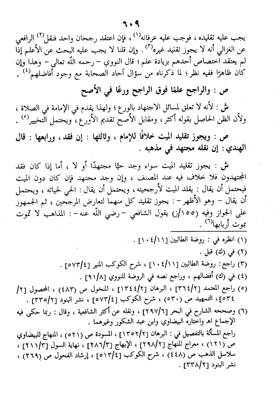 ش: يجوز تقليد الميت سواء وجد حيا مجتهدا أو لا، أما إذا كان فقد المجتهدون فلا خلاف فيه عند المصنف وإن وجد مجتهد فإن كان دون الميت فيحتمل أن يقال: يقلد الميت لأرجحيته ويحتمل أن يقال: الحي لحياته، ويحتمل أن يقال -وهو الأظهر-: يجوز تقليد كل منهما لتعارض المرجحين، ثم الجمهور على الجواز وفيه (١٥٥/ز) يقول الشافعي رضي الله عنه: المذاهب لا تموت بموت أربابها.