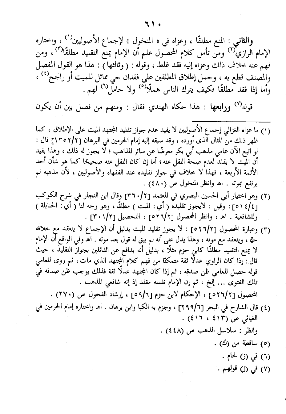والثاني: المنع مطلقا، وعزاه في (المنخول) لإجماع الأصوليين واختاره الإمام الرازي ومن تأمل كلام (المحصول) علم أن الإمام يمنع التقليد مطلقا، ومن فهم عنه خلاف ذلك وعزاه إليه فقد غلط، وقوله: (وثالثها): هذا هو القول المفصل والمصنف قطع به، وحمل إطلاق المطلقين على فقدان حي مماثل للميت أو راجح وأما إذا فقد مطلقا فكيف يترك الناس هملا ولا حامل لهم.